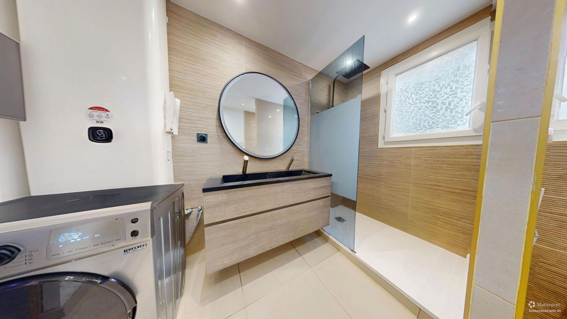 La salle d'eau, spacieuse et fonctionnelle, dispose d'un emplacement pour lave-linge, d'une grande cabine de douche et de toilettes.