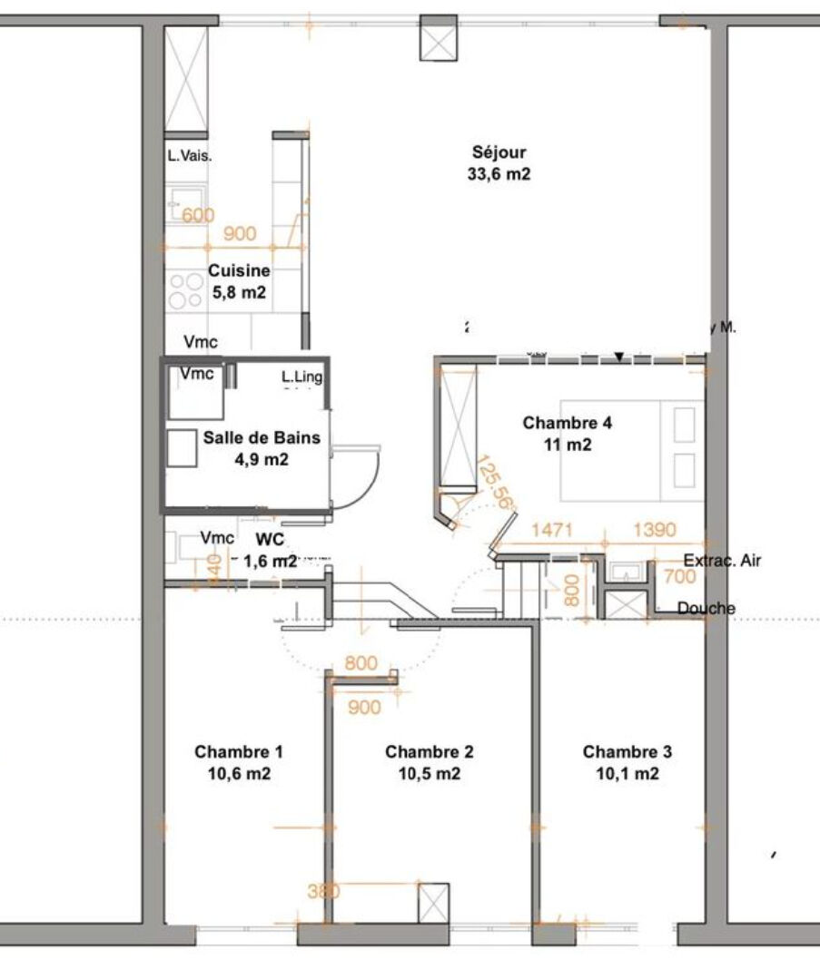 Le bien dispose de 4 vraies chambres, dont une avec coin douche, mais aussi une cuisine américaine, une salle de bains et des wc séparés.