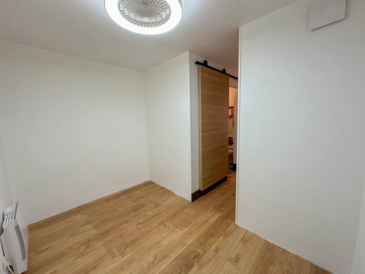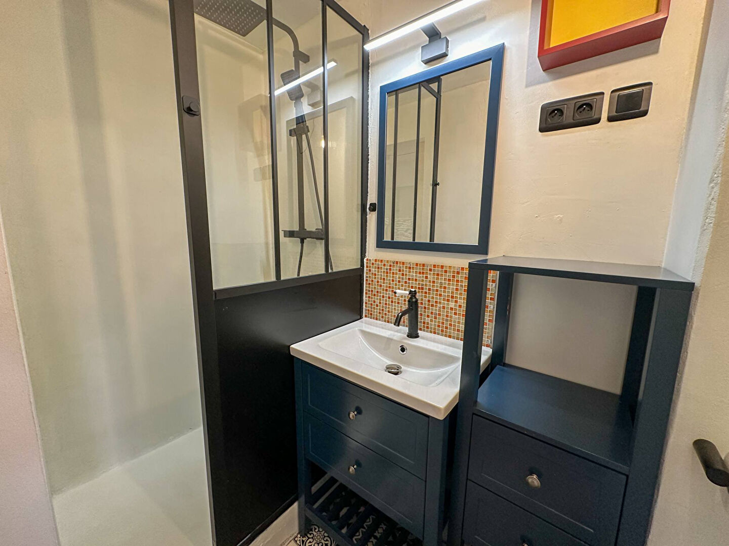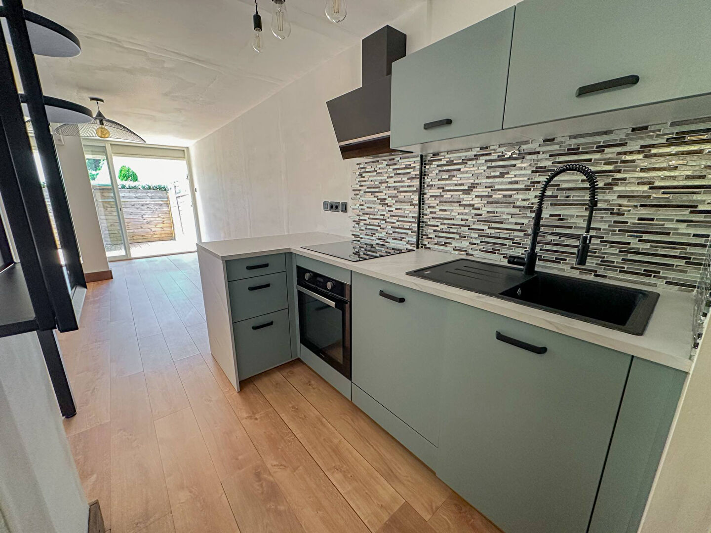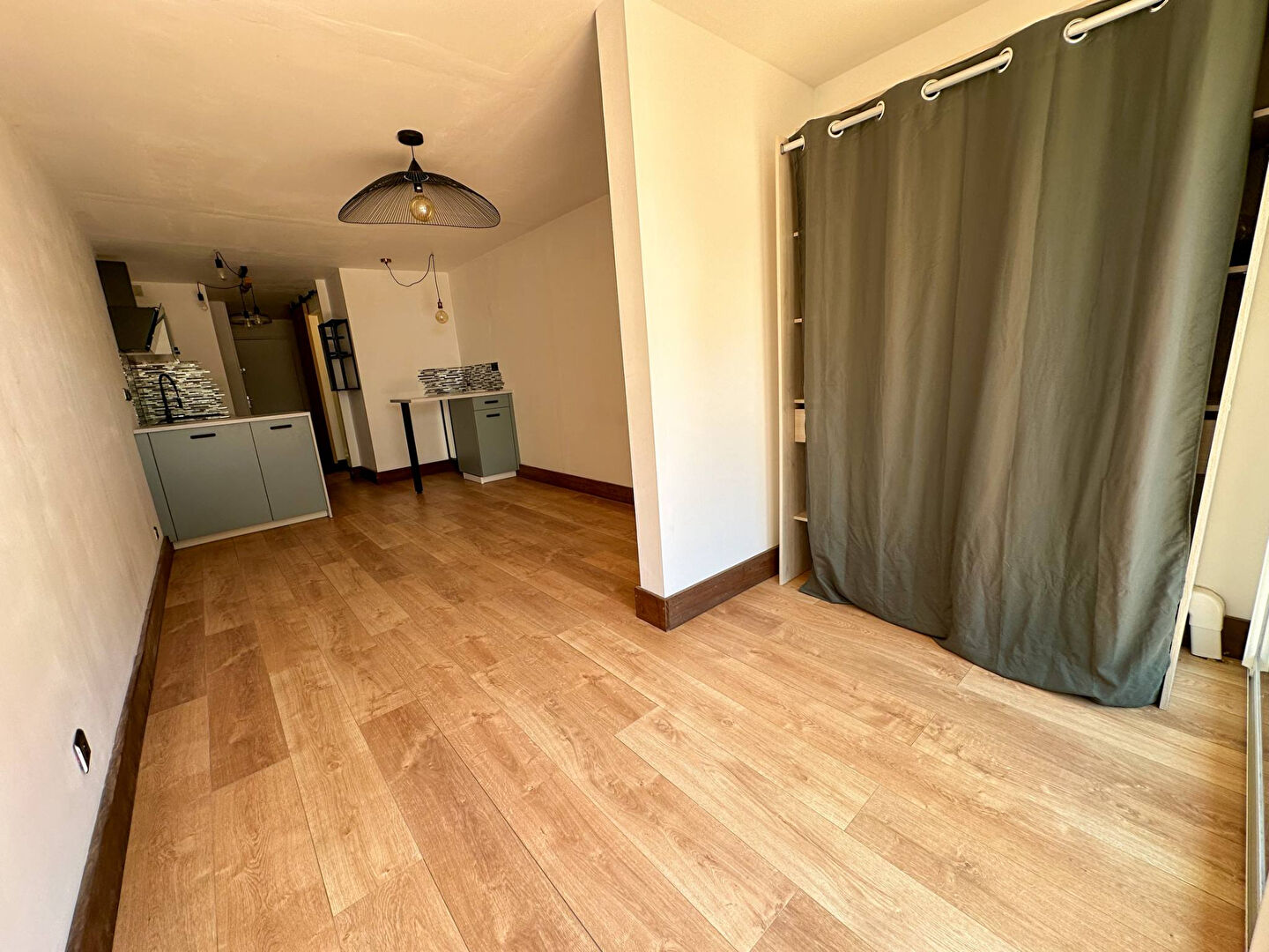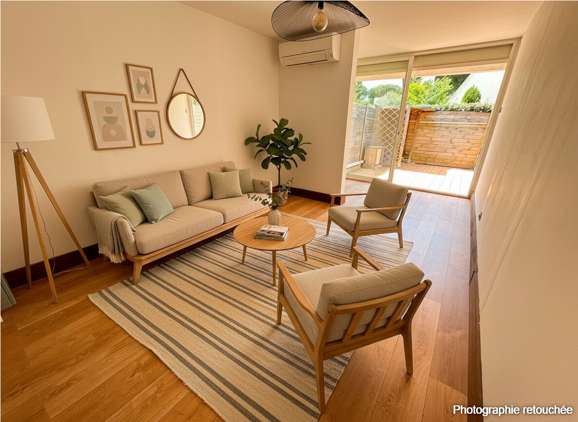 En rez-de-jardin, il offre un agencement optimisé avec une cabine permettant l'installation d'un lit en 140, idéale pour créer un véritable coin nuit indépendant. La pièce de vie, lumineuse, s'ouvre sur une agréable terrasse d'environ 15 m² exposée ouest.