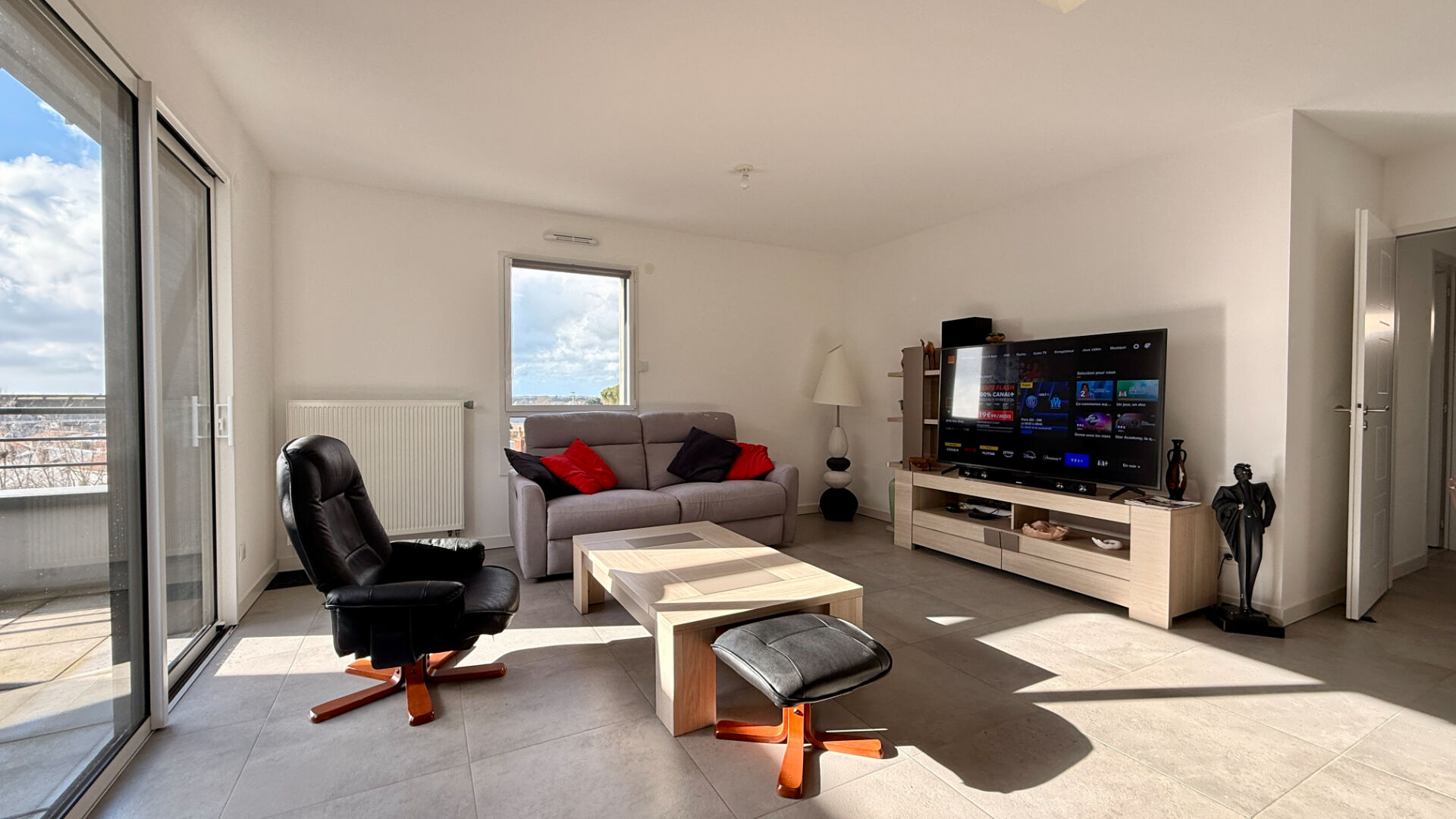 EN EXCLUSIVITE - Au 3 eme et dernier étage, dans le quartier de la gare, résidence récente, appartement T3 comprenant une entrée, une salle d'eau avec douche italienne et double vasque, un wc séparée, un vaste salon séjour trés lumineux exposé SUD-OUEST avec vue sur les toit de plus de 45 m2, un cellier, une cuisine aménagée et équipée, un grande terrasse, un patio totalisant 28 m2 d'extérieur. Au sous sol, un grand garage de 35 m2 avec porte motorisée. A voir rapidement !