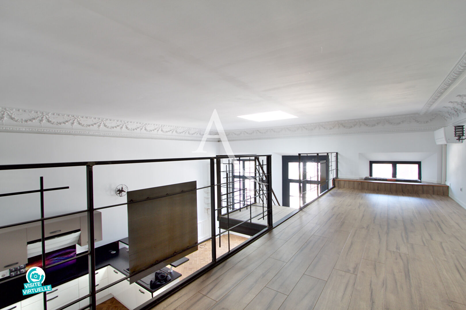 On retrouve dans cet appartement climatisé, une pièce de vie lumineuse avec TRÈS BELLE HAUTEUR SOUS PLAFOND intégrant une cuisine équipée ; ainsi qu'une immense mezzanine confortable pouvant faire office de bureau ou de 3e chambre.