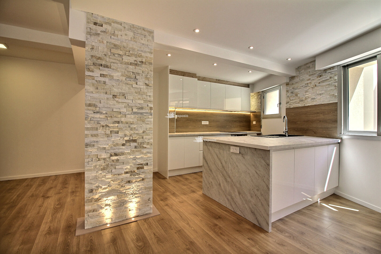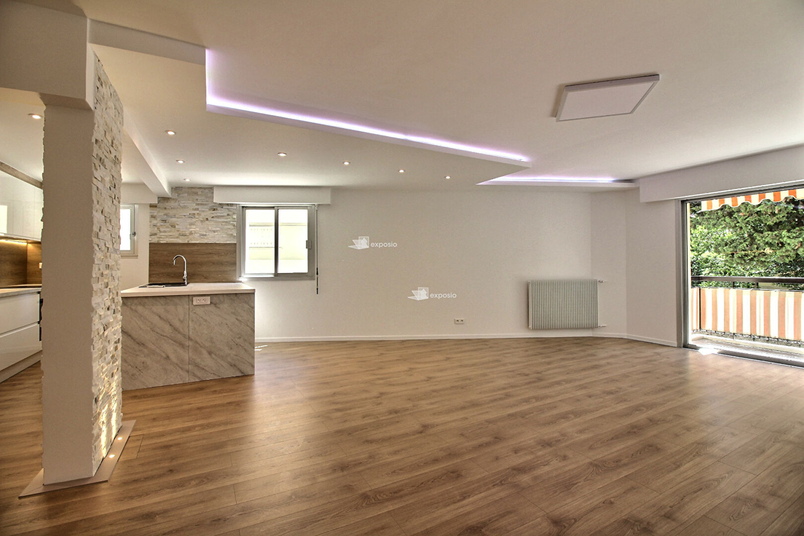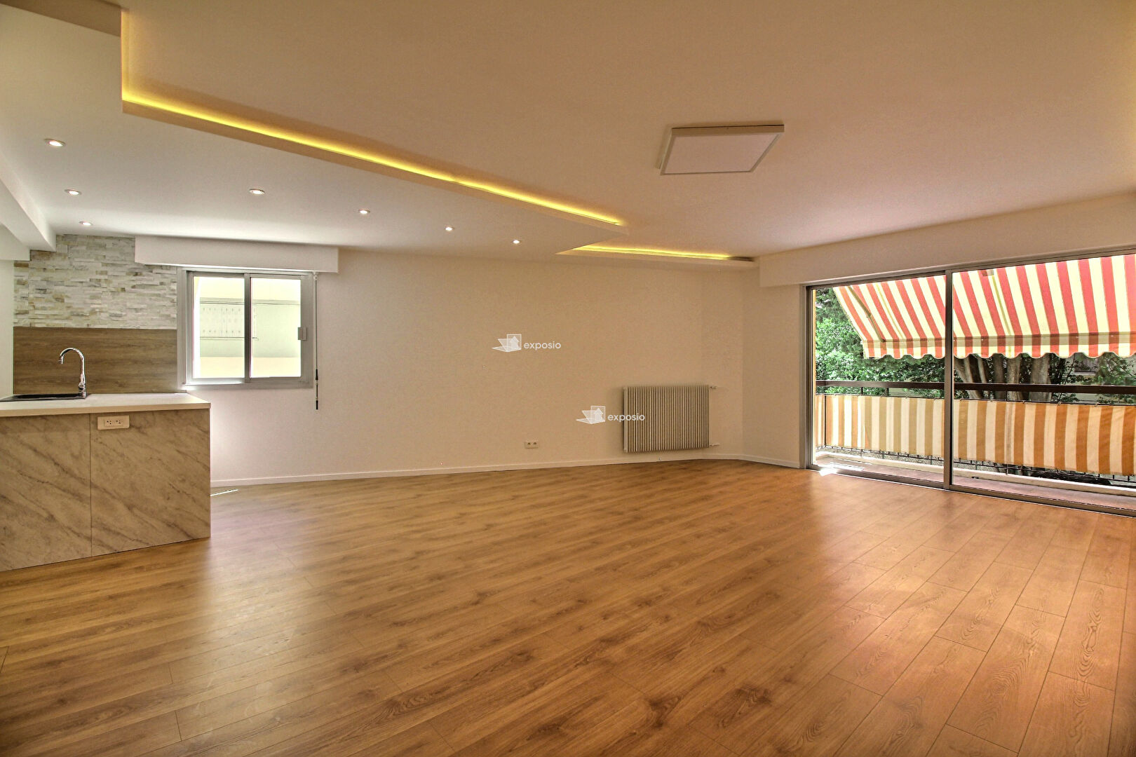 Le Cannet/limite Cannes proche du Lycée Carnot, Beau 3 pièces traversant de 83,52 m² LC, entièrement rénové et climatisé, belles prestations; Hall d'entrée, toilette séparée avec lave-mains, double séjour avec cuisine ouverte aménagée et semi-équipée, donnant sur terrasse, sud/ouest au calme.