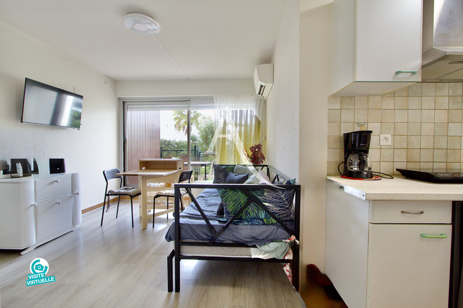 L'appartement, vendu meublé et équipé, dispose d'une pièce de vie fonctionnelle et climatisée avec coin-cuisine, d'une salle d'eau avec WC , ainsi que d'une agréable terrasse couverte exposée OUEST disposant d'un portillon d'accès.