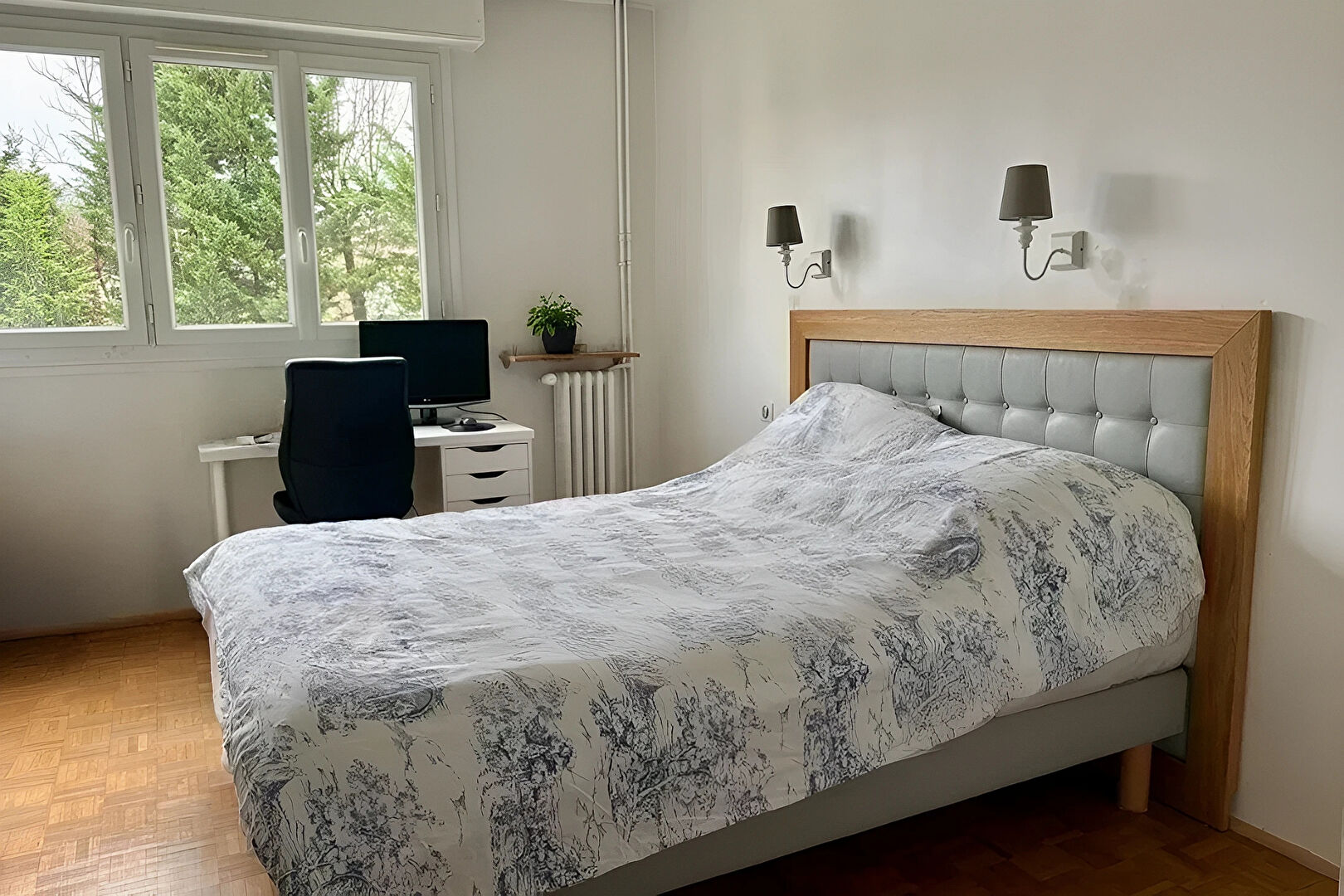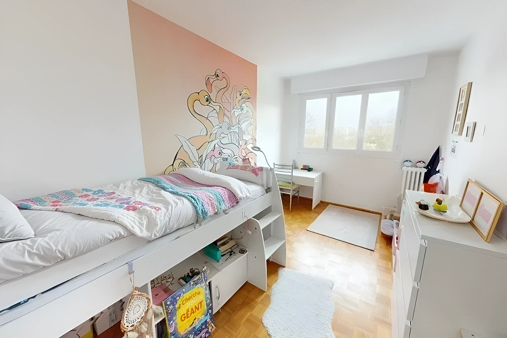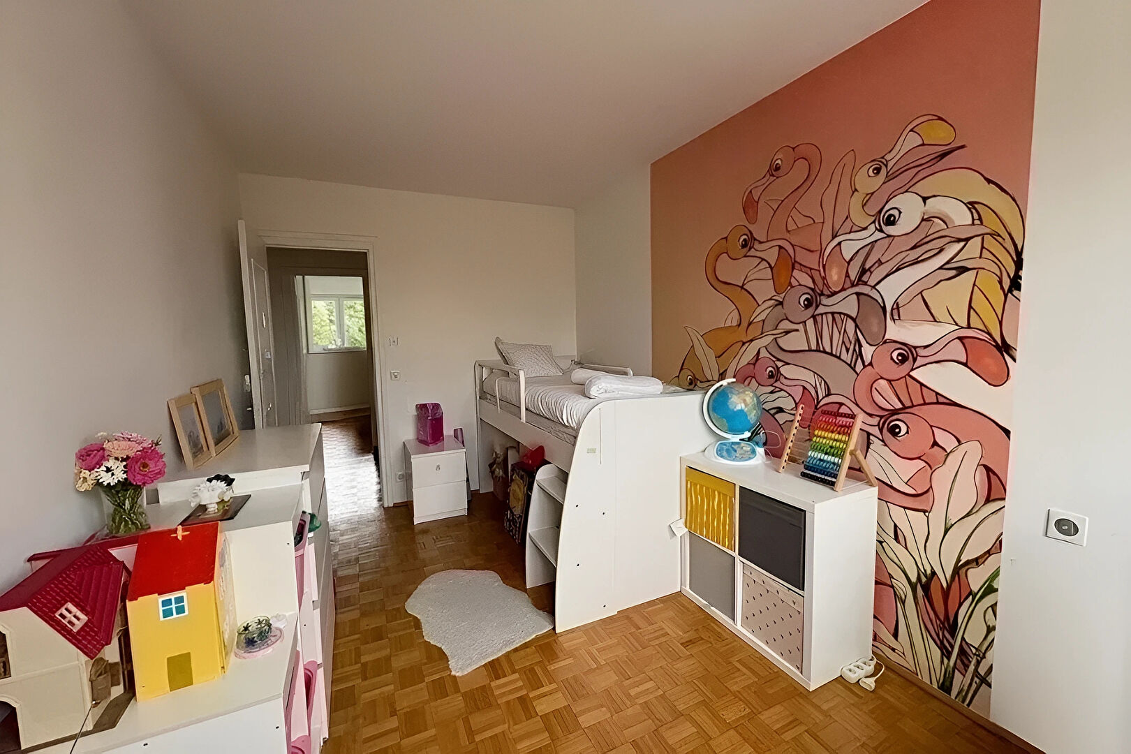 Prestations : double vitrage, électricité refaite, moulures, parquet chêne mosaïque, distribution optimisée et remarquable luminosité.