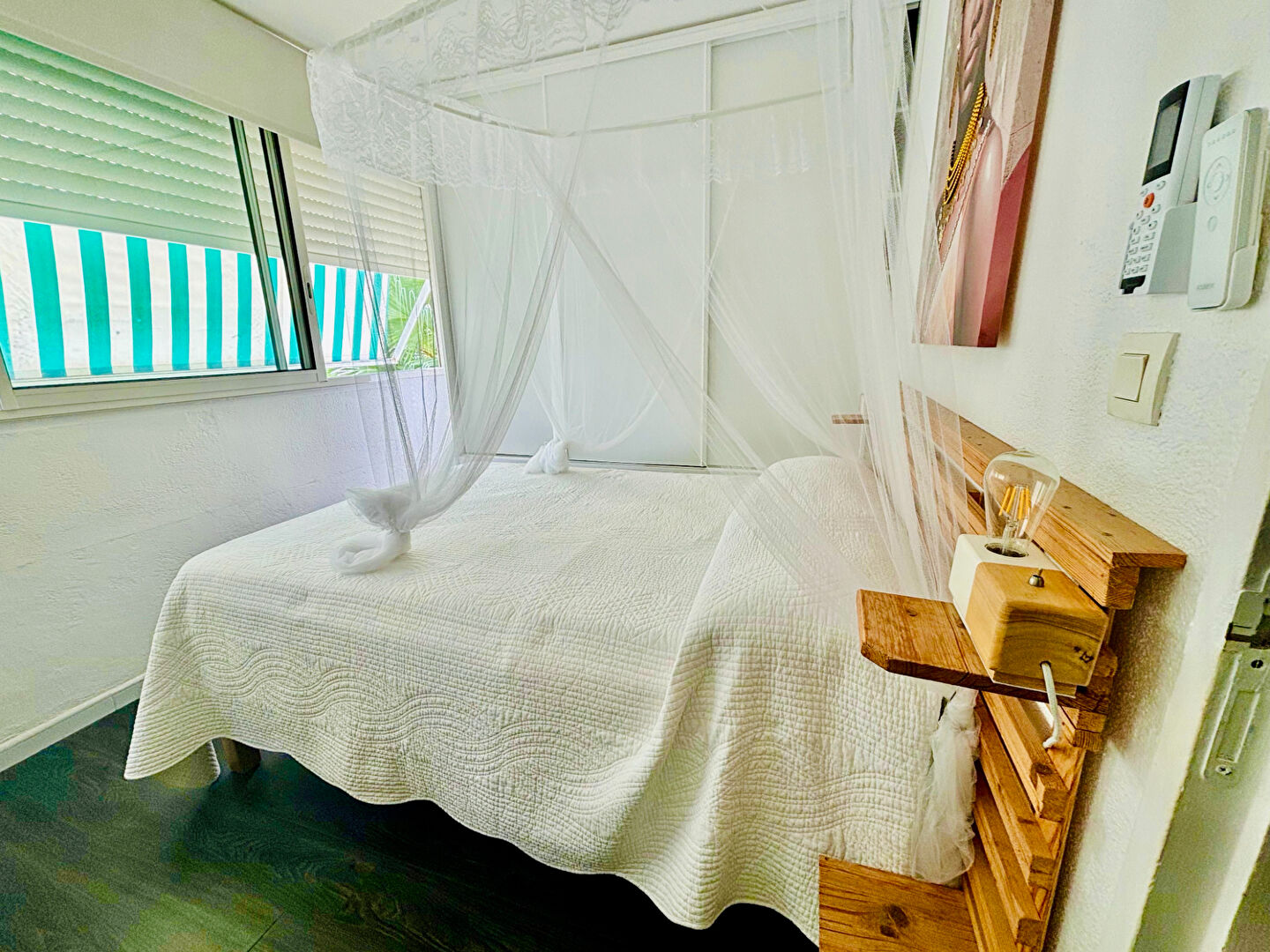 L'appartement dispose d'un salon lumineux et climatisé avec une cuisine ouverte, aménagée et équipée, offrant un espace convivial et fonctionnel. La chambre, climatisée, assure un confort optimal en toute saison. Une jolie terrasse fermée de 5m² vient compléter ce bien, parfaite pour profiter de la douceur du climat.