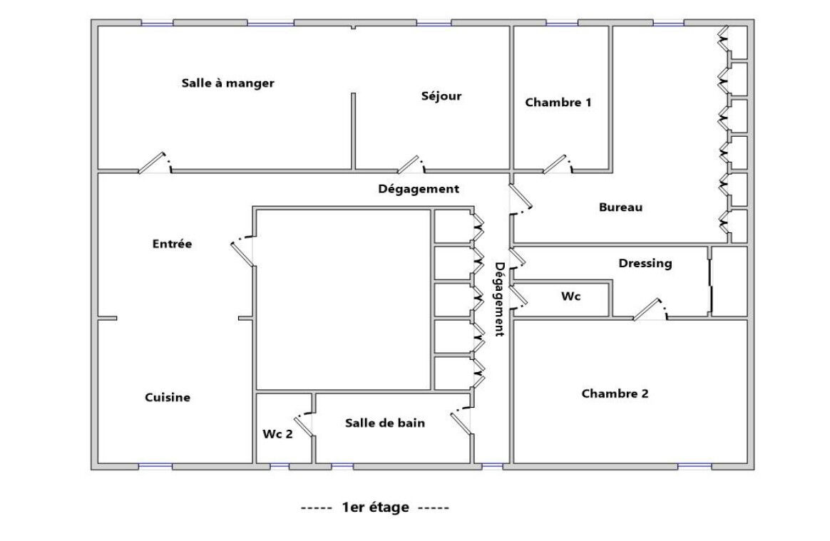 Il se compose d'une grande cuisine équipée ouverte, d'une salle à manger, d'un séjour. Un grand couloir avec de nombreux placards vous emmène au coin nuit, comprenant une grande chambre avec dressing, 2 autres chambres, salles de bains avec WC, et 1 WC séparé.