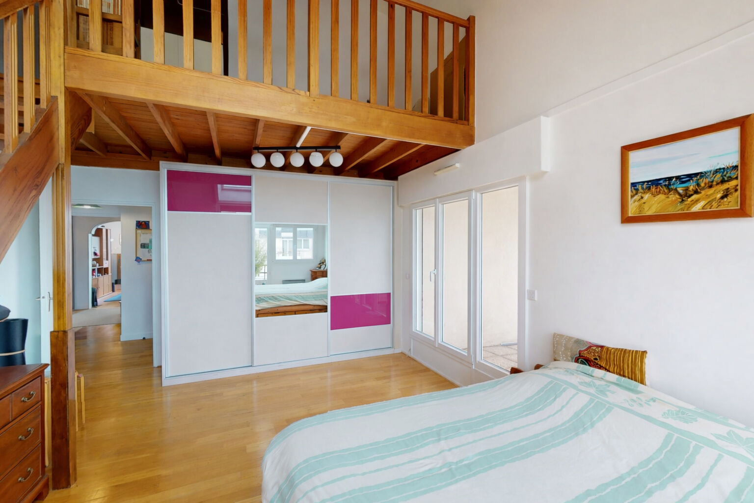 Cet appartement comprend : Une cuisine séparée , un double séjour avec plafond cathédrale donnant sur une terrasse , salle de bains, un WC, 3 chambres dont une de 19m2 + un bureau 7.69 m2 en mezzanine...