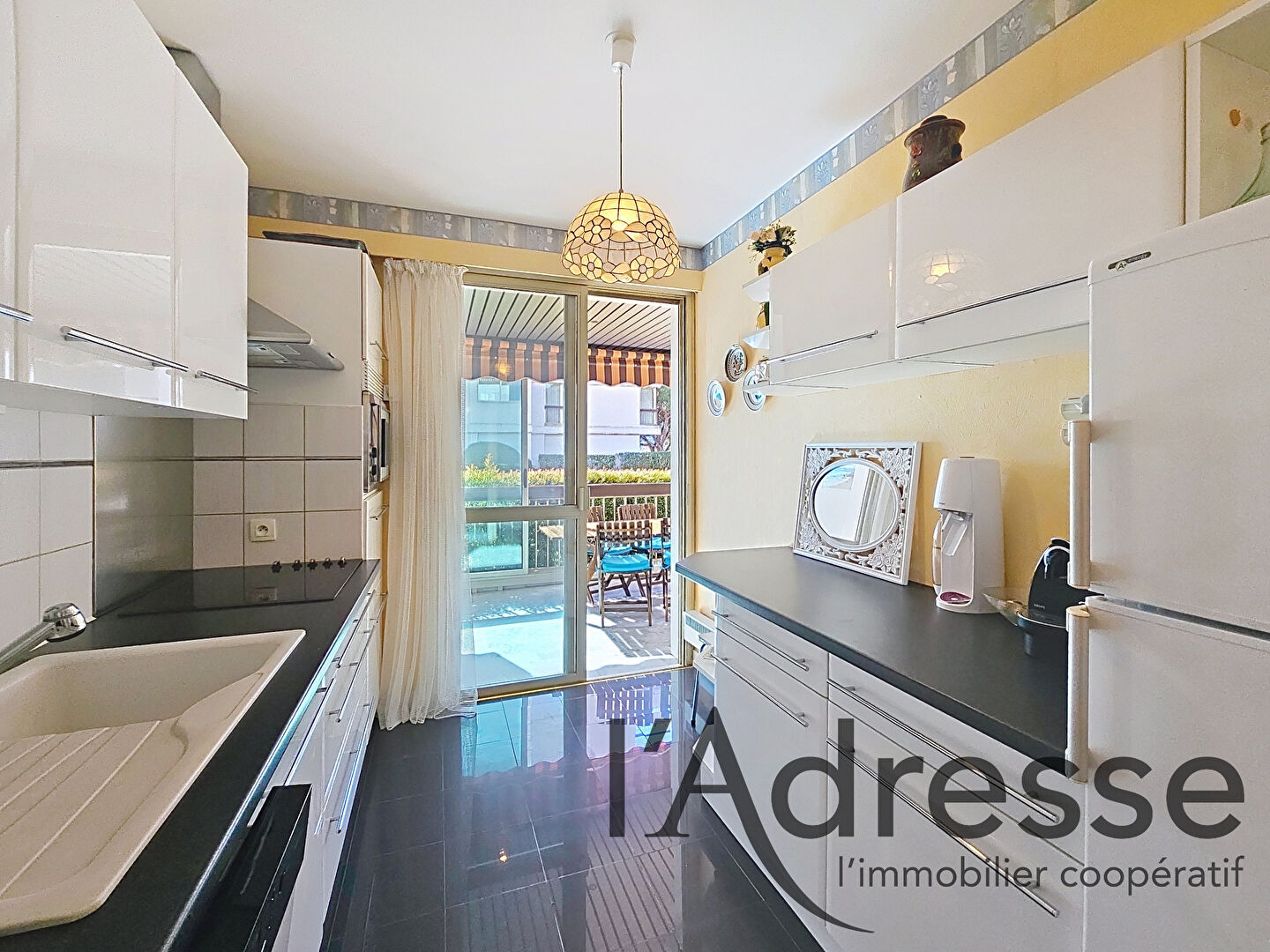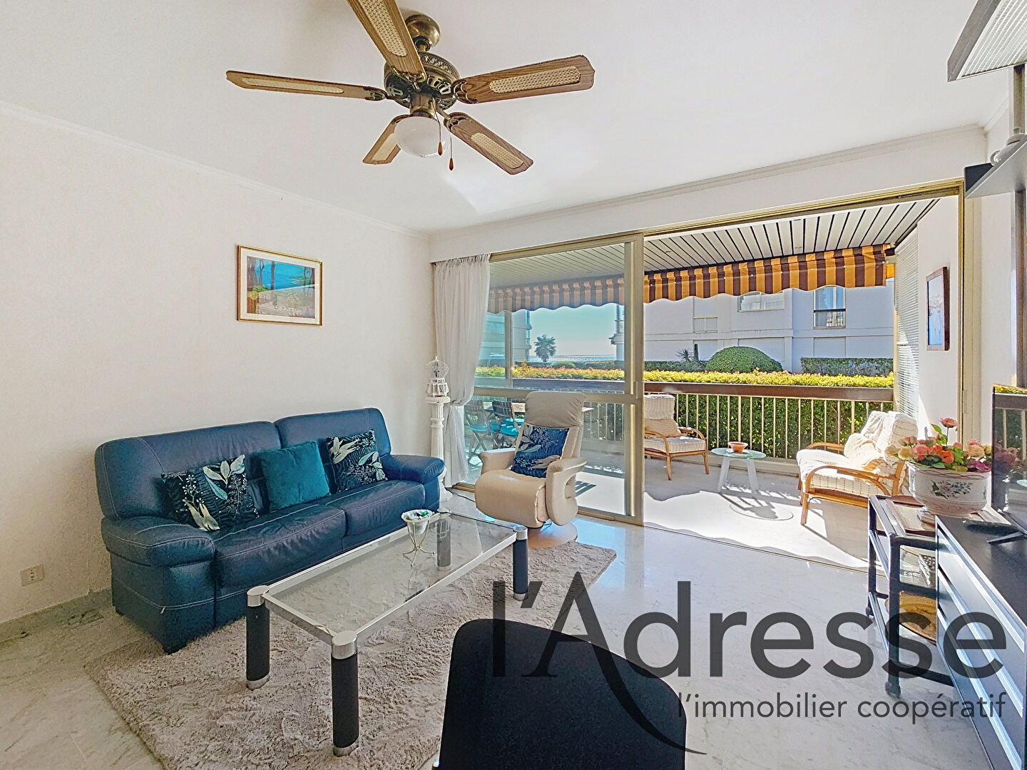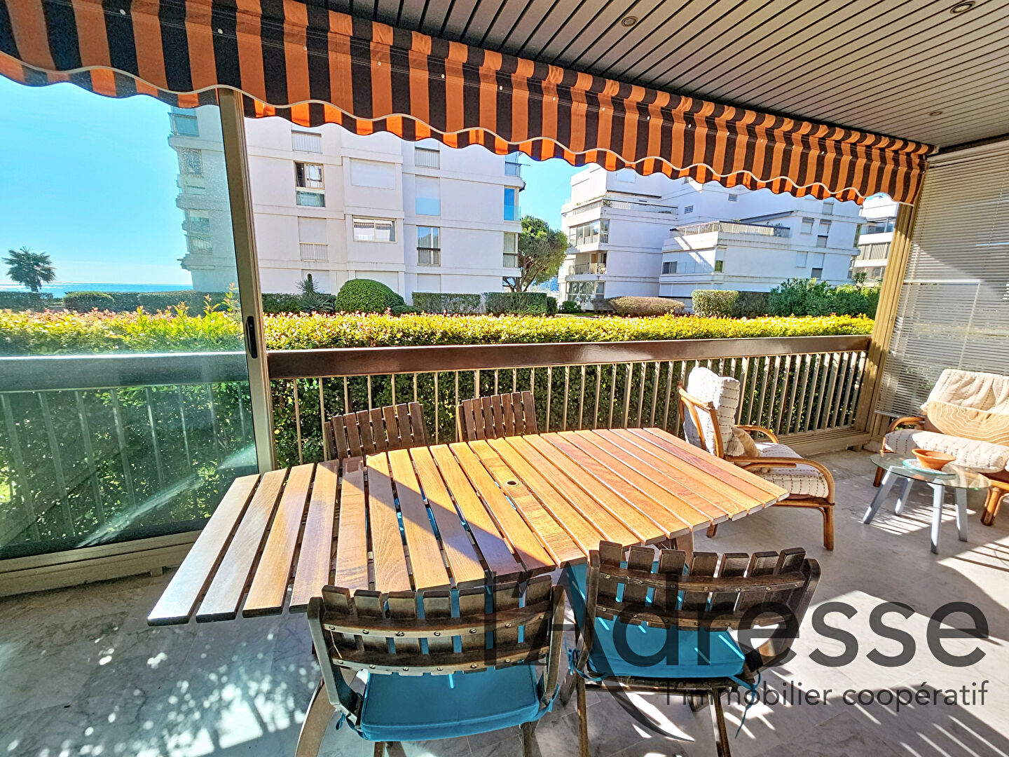 L'appartement offre un séjour lumineux ouvert sur une profonde terrasse, véritable pièce de vie, avec un bel aperçu mer et un environnement verdoyant, au calme.