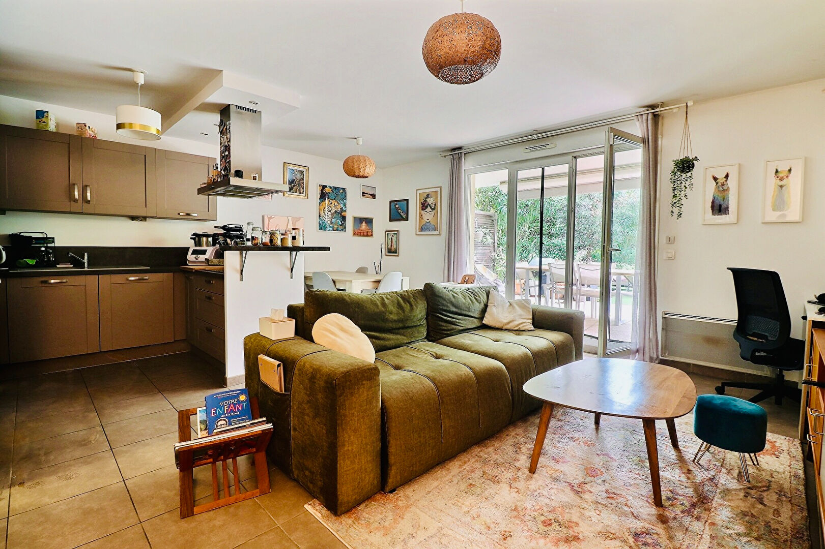 Traversant et baigné de lumière, il se compose d'un bel espace de vie avec séjour et cuisine ouverte donnant directement sur le jardin exposé plein Sud.