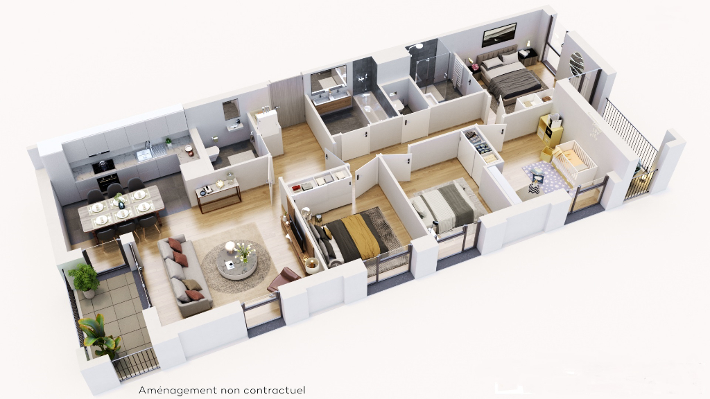 Appartement 5 pièces d'environ 96m² offrant : entrée, séjour avec cuisine ouverte donnant sur loggia, dégagement, 1 suite parentale avec salle d'eau donnant sur loggia, 3 chambres avec rangements, salle de bains, 2 W.C. Une place de parking en sous sol, complète ce bien.