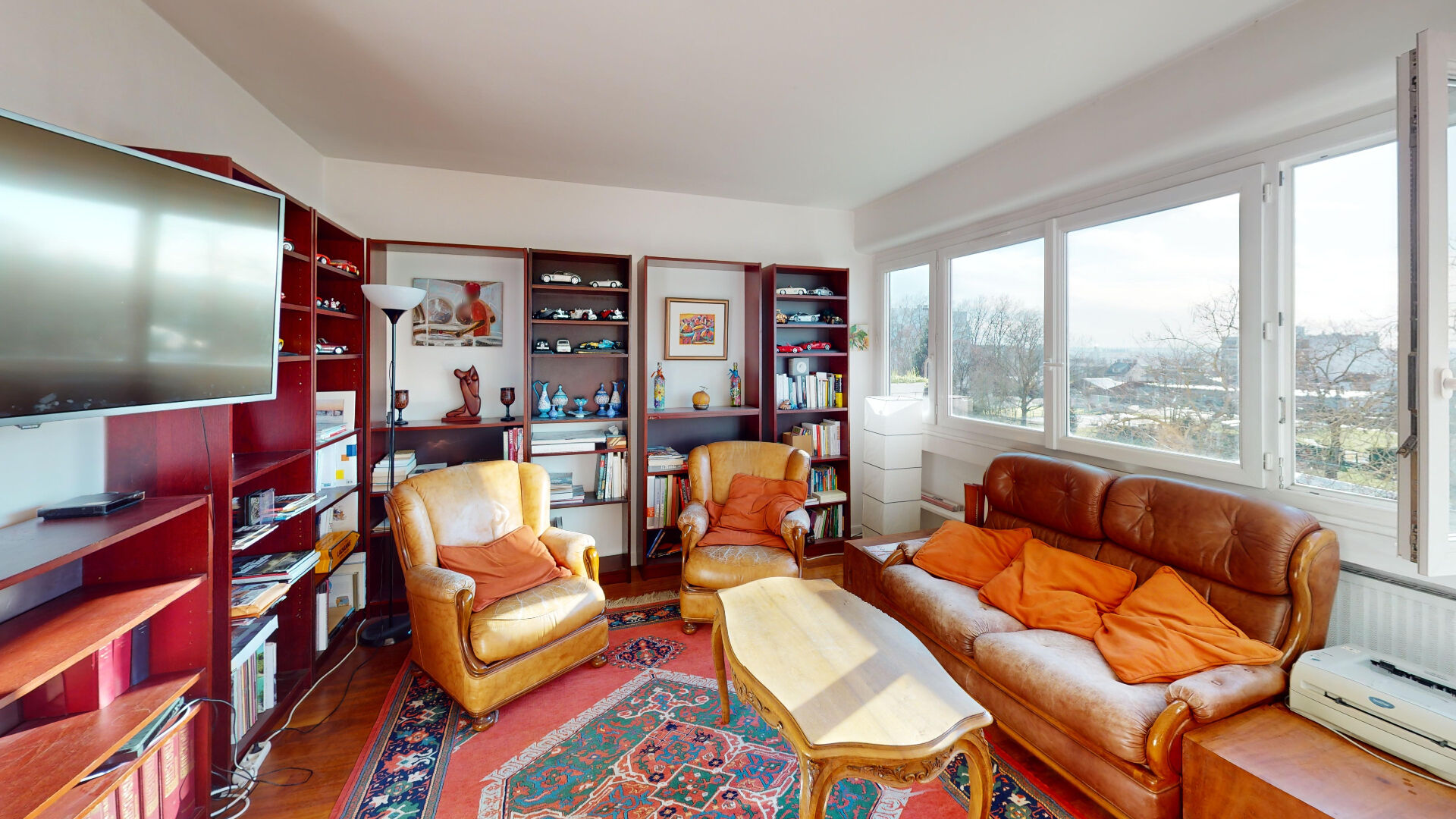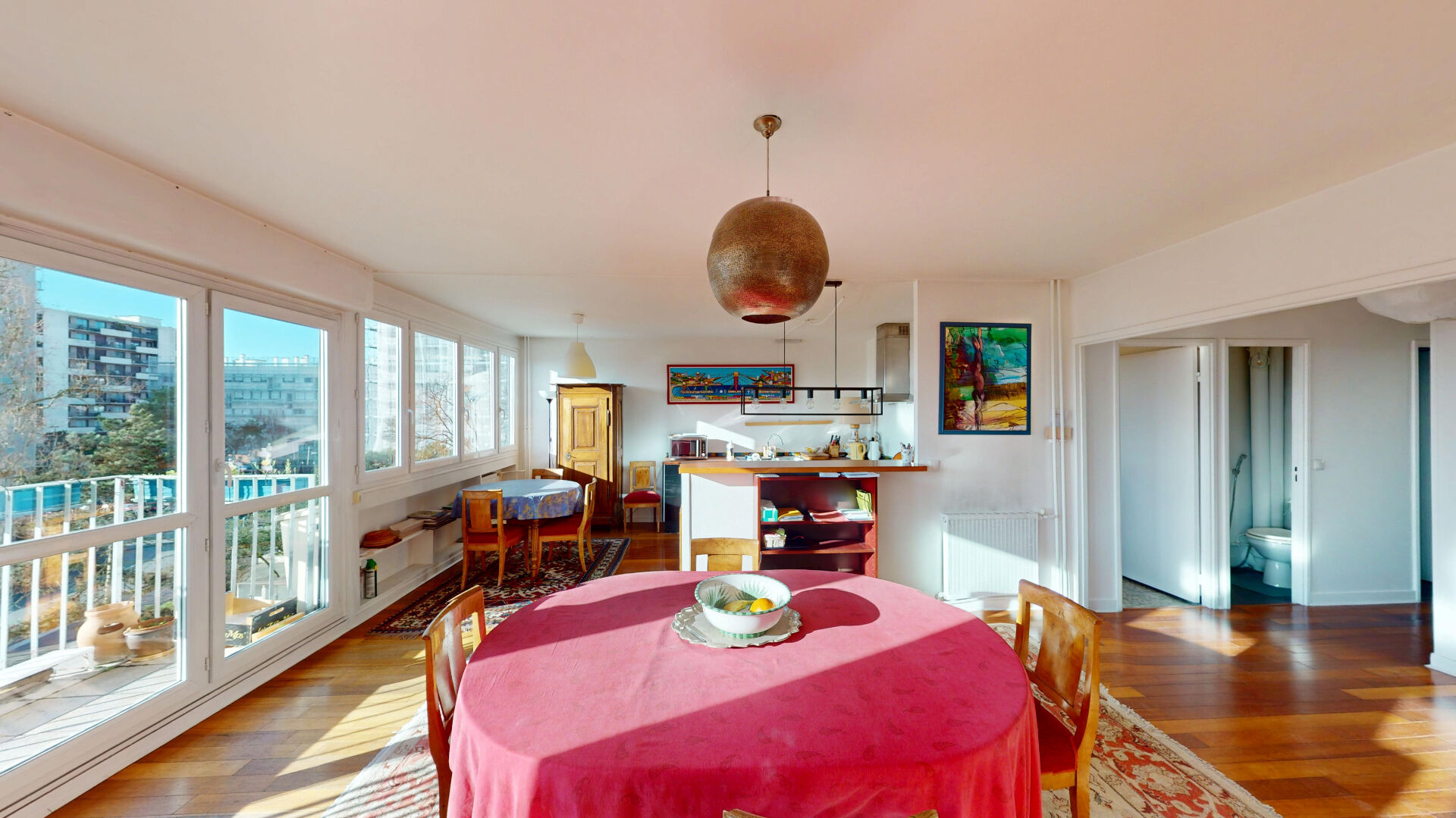 Appartement traversant de 5 pièces et 3 chambres (possibilité 4ème chambre) avec des beaux volumes : espace de vie de 43m² exposé plein sud avec belle vue dégagée, baies vitrées sur toute la longueur.