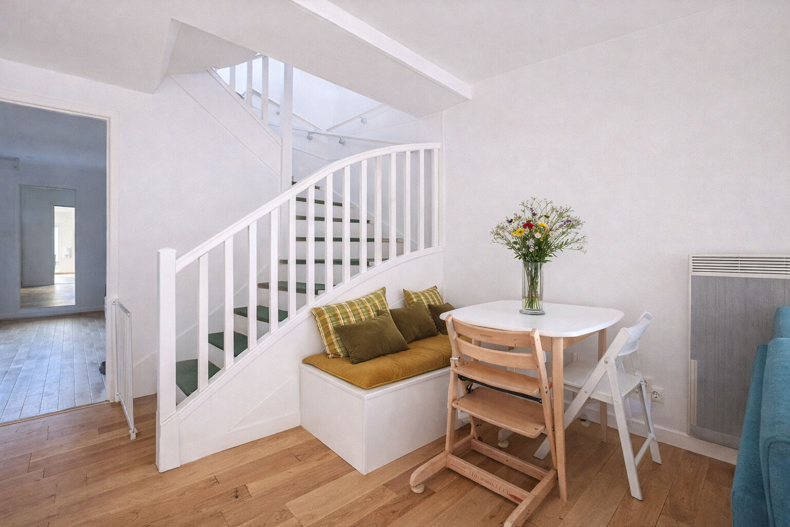 Un espace dinatoire convivial, organisé autour de l'escalier, prolonge naturellement cet espace.