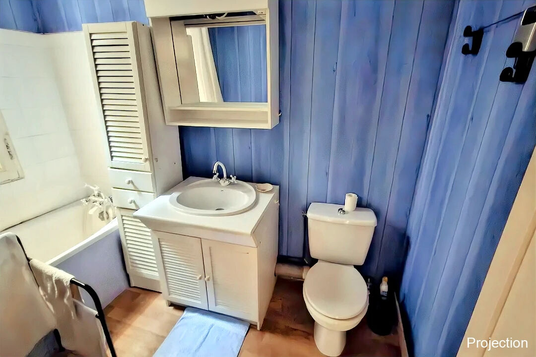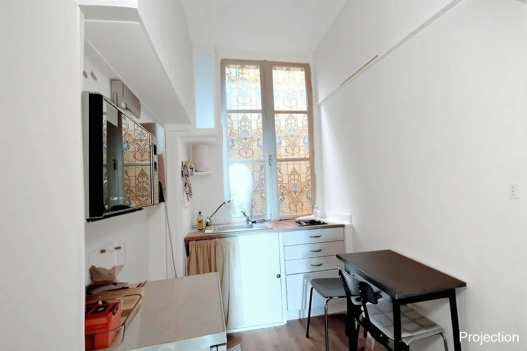 Il se compose d'une entrée ouvrant sur un séjour lumineux ainsi qu'un cellier/bureau donnant sur une rue semi-piétonne. Un couloir mène à une chambre avec salle de bains attenante et à un espace cuisine équipé d'une kitchenette.