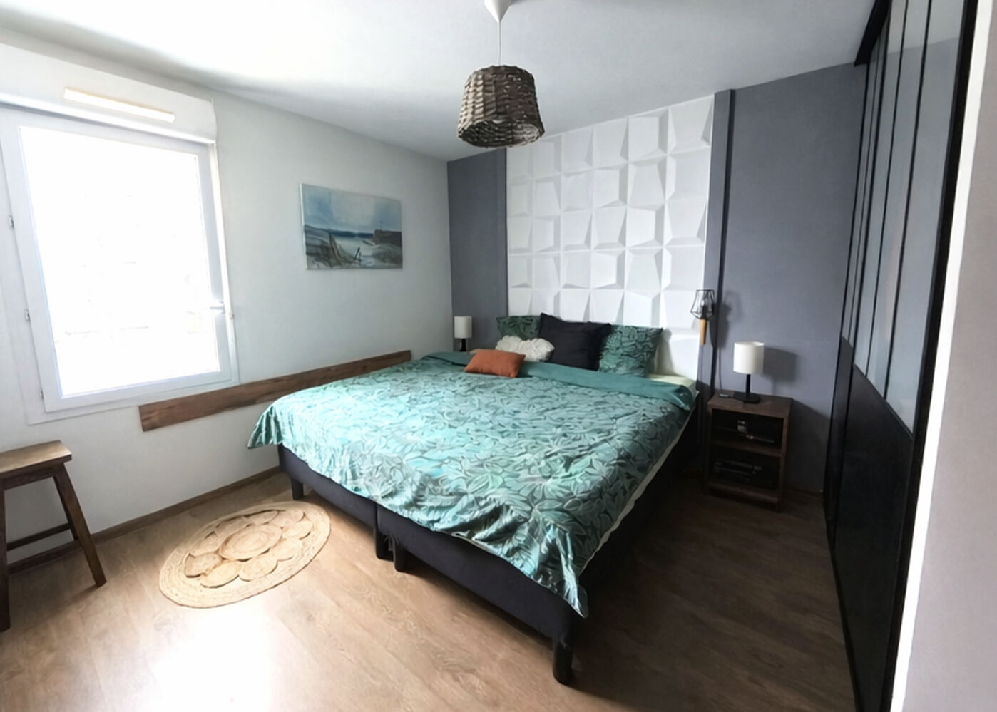 La partie nuit est composée d'une chambre de 12 m² avec placard, avec sa salle de bain attenante, son dégagement permettant du rangement et les WC aux normes PMR et avec lave-mains.