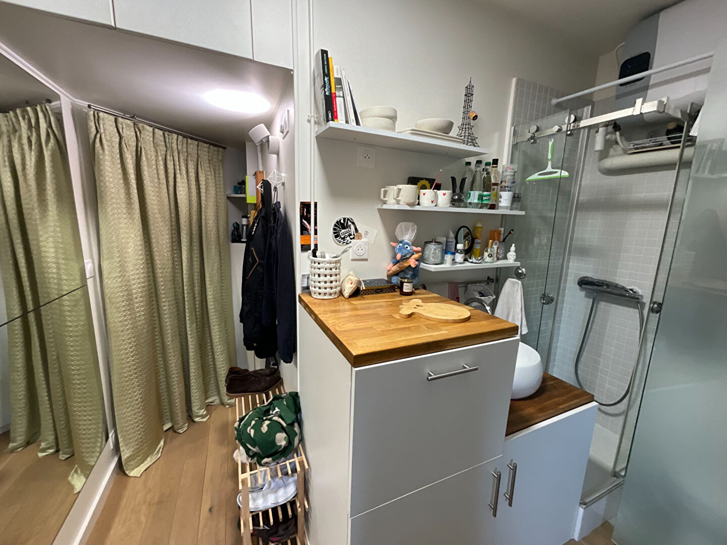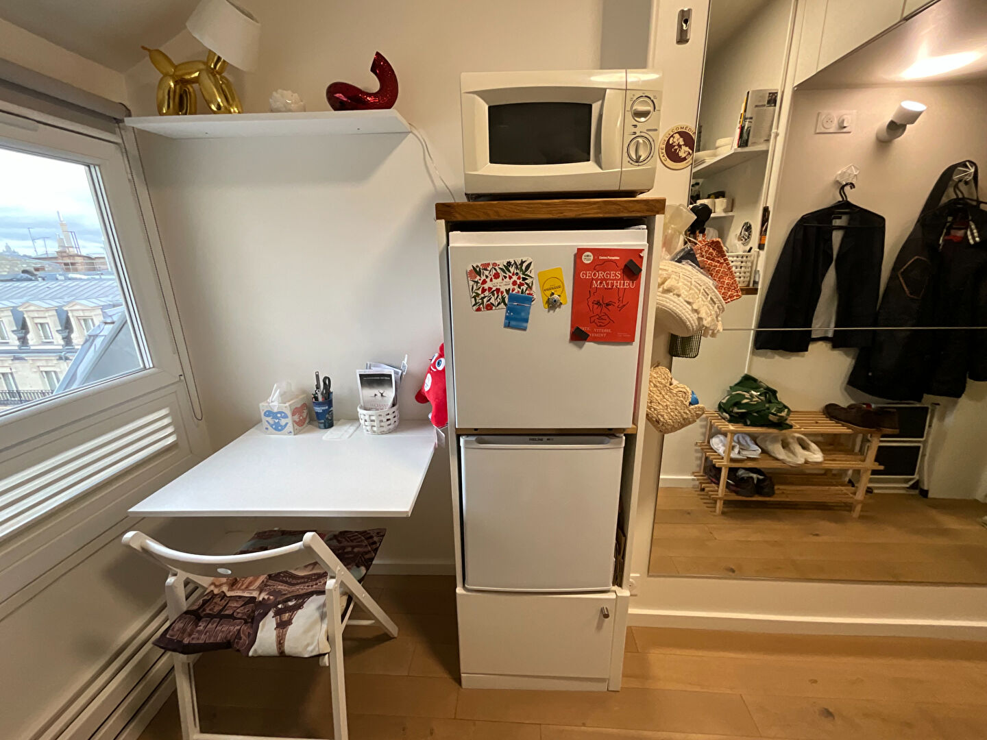 **Fully renovated pied-à-terre with a view over the rooftops of Paris? Elegance and functionality in the heart of the capital** **A breathtaking view** From the moment you arrive, be captivated by an exceptional view over the rooftops of Paris and the iconic silhouette of the Eiffel Tower. This pied-à-terre, nestled under the eaves, offers a rare and romantic perspective on the City of Lights, ideal for relaxing moments or intimate dinners with an unforgettable panorama. **An optimized and welcoming interior** Completely renovated, this property combines modernity and Parisian charm. Every space has been designed to maximize comfort and functionality: **Entrance and circulation**: The entrance, with its light gray wooden doors and parquet flooring, sets the tone for a refined and welcoming interior. A practical storage space and a discreet ladder provide access to the attic or upper shelves. **Open and inviting kitchen**: The kitchen, equipped with a solid wood worktop and open shelving, is both practical and aesthetically pleasing. It opens onto a dining or office space, bathed in natural light thanks to a large window. Decorative shelves and carefully chosen accessories add a personal and welcoming touch. **Modern and Functional Bathroom**: The bathroom, furnished with contemporary materials, includes a walk-in shower, a designer sink on a wooden vanity, and storage shelves. Integrated mirrors and lighting optimize the space, while decorative touches create a cozy atmosphere. **Attic Bedroom**: The bedroom, located under the eaves, is a snug haven with a comfortable bed, floral wall art, and a desk by the window. Abundant natural light and views over the Parisian rooftops make it a unique place to relax or work. **Access and Amenities**: The building has a modern elevator and a well-maintained staircase, providing easy access to this rooftop retreat. Storage spaces are optimized for everyday use or extended stays. **An exceptional location** Located near the Arc de Triomphe, this pied-à-terre benefits from an exceptional location.