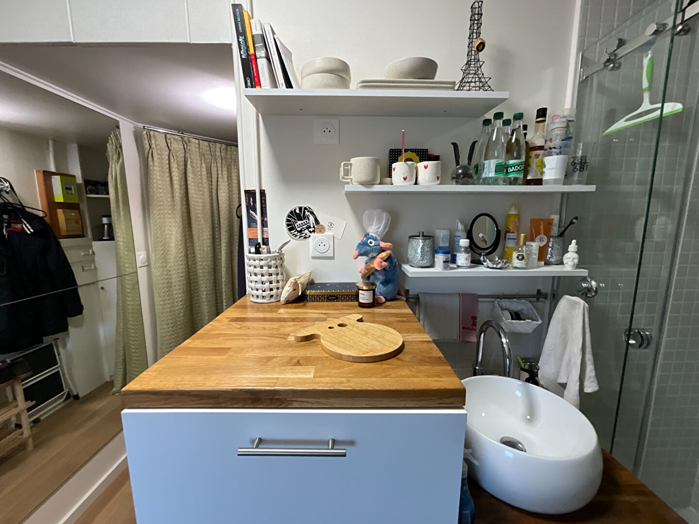 La cuisine, équipée d'un plan de travail en bois massif et d'étagères ouvertes, est à la fois pratique et esthétique. Elle s'ouvre sur un espace repas ou bureau, baigné de lumière naturelle grâce à une grande fenêtre. Les étagères décoratives et les accessoires soigneusement choisis ajoutent une touche personnelle et chaleureuse.