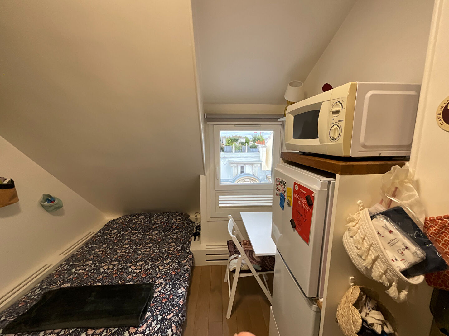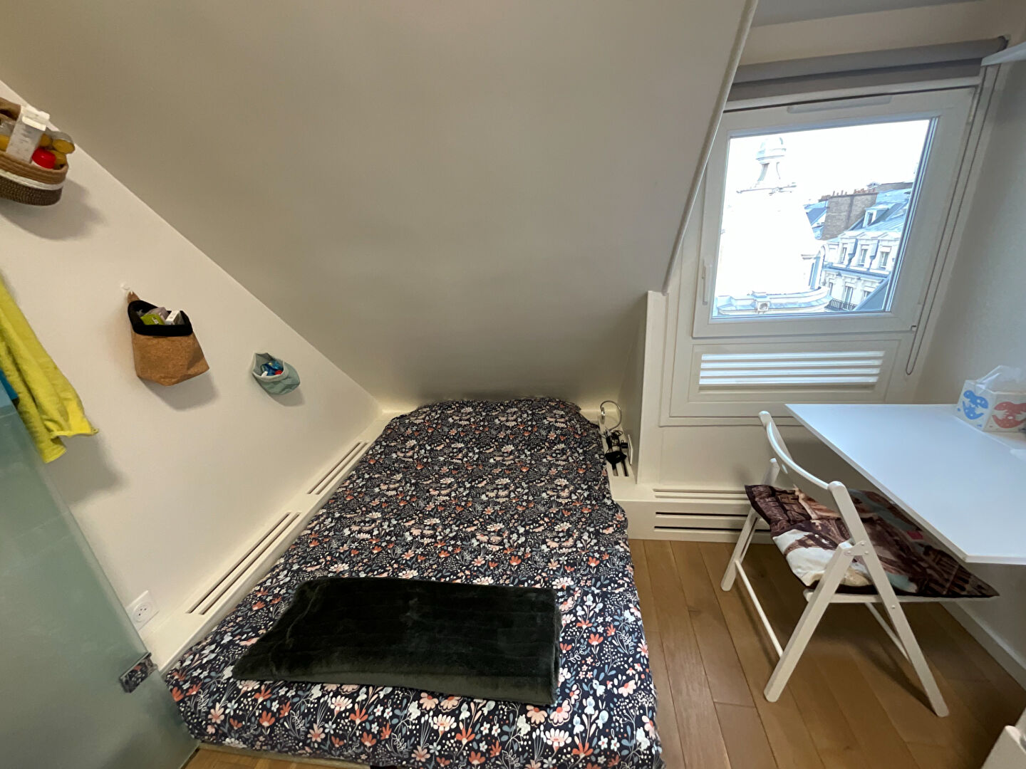 La chambre, située sous les combles, est un cocon douillet avec un lit confortable, une décoration murale florale, et un bureau sous la fenêtre. La lumière naturelle y est généreuse, et la vue sur les toits parisiens en fait un lieu unique pour se reposer ou travailler.