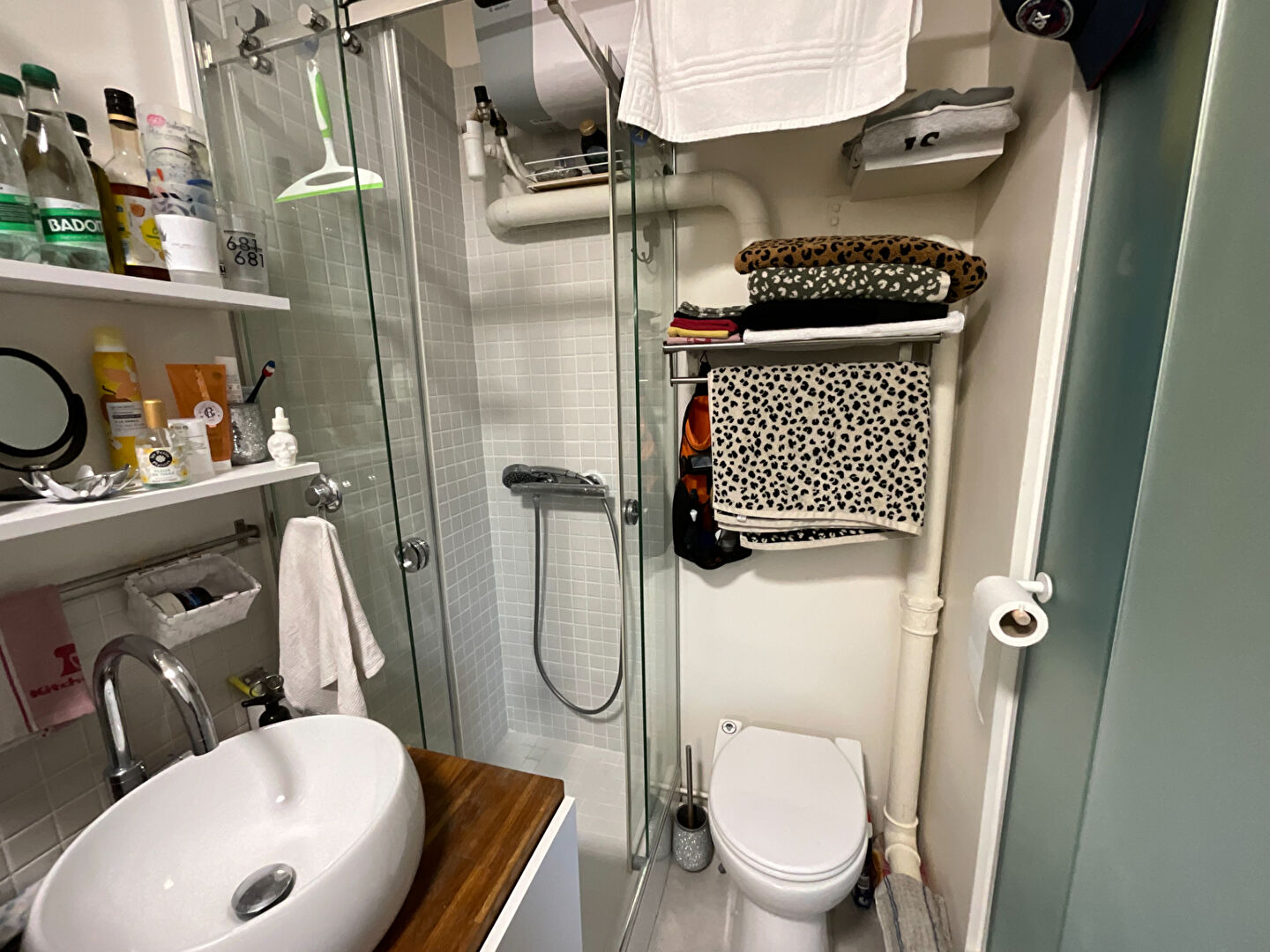 La salle de bain, aménagée avec des matériaux contemporains, comprend une douche à l'italienne, un lavabo design sur meuble bois, et des étagères de rangement. Les miroirs et éclairages intégrés optimisent l'espace, tandis que les touches déco apportent une ambiance cosy.