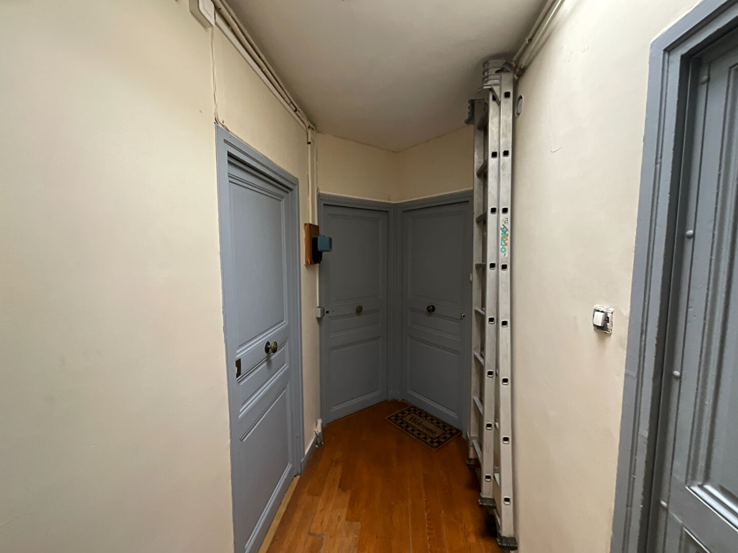 L'entrée, avec ses portes en bois gris clair et son sol en parquet, donne le ton d'un intérieur soigné et accueillant. Un espace rangement pratique et une échelle discrète permettent d'accéder aux combles ou aux étagères hautes.