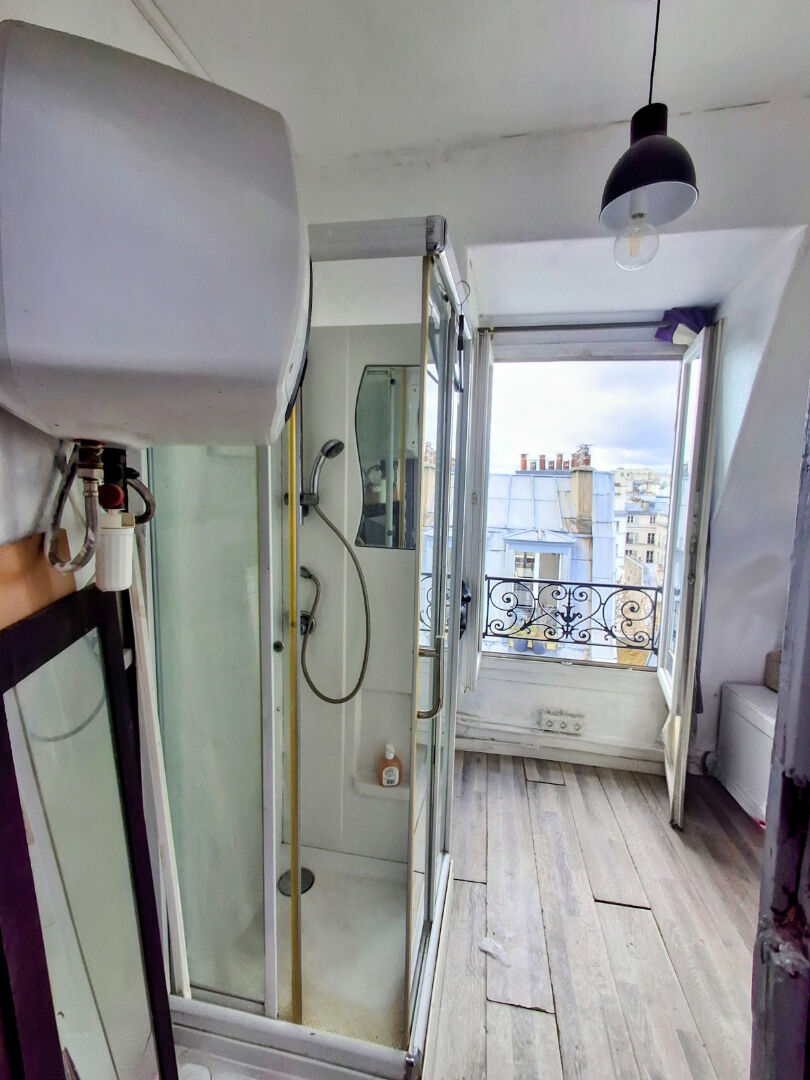Cette pièce lumineuse et calme bénéficie d'une vue dégagée sur les toits parisiens, incluant le Sacré-Coeur à droite et la Tour Eiffel à gauche. Une pièce de vie avec cabine de douche ( un ballon d'eau chaude récent et kitchenette).