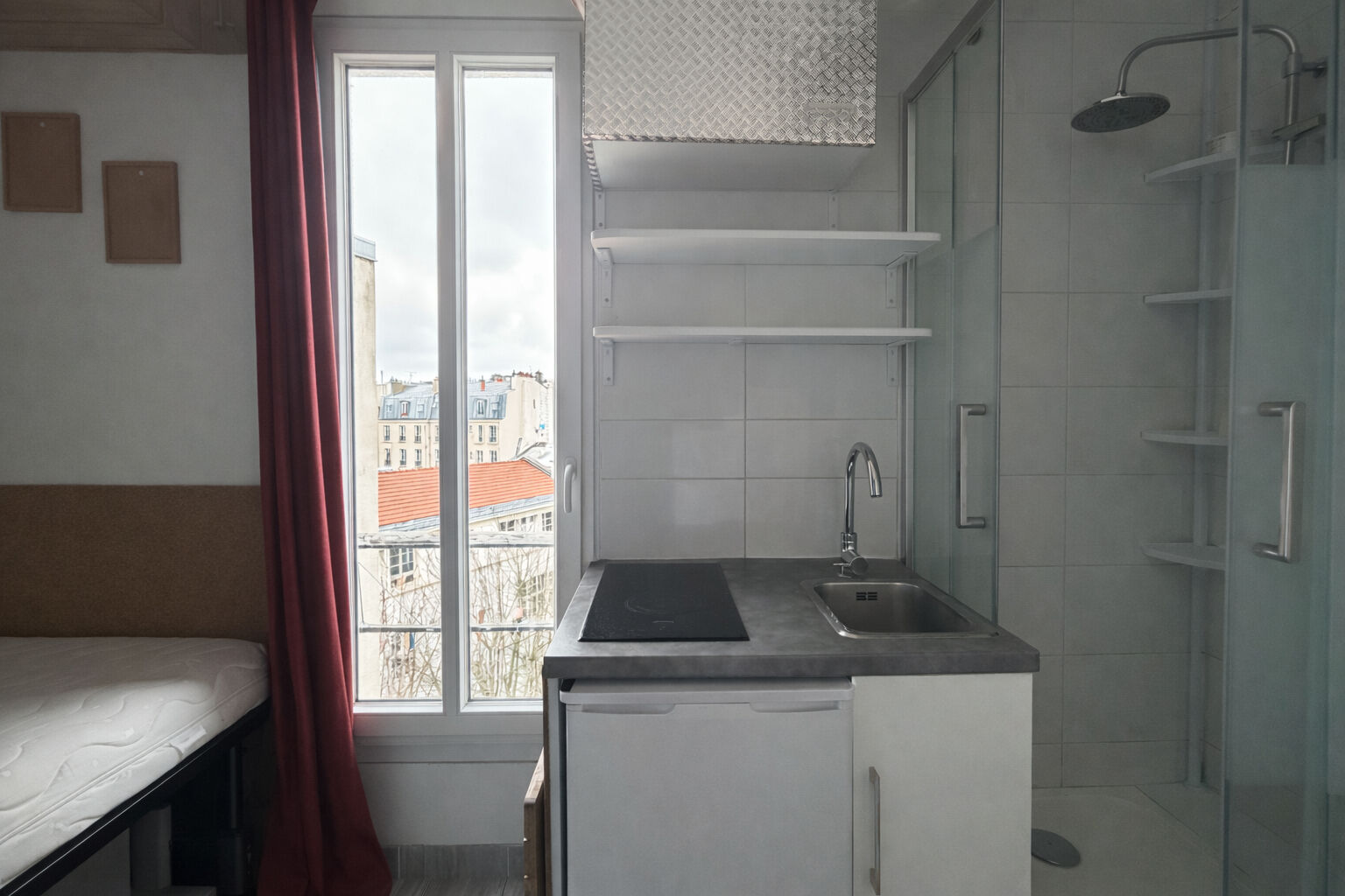 La studette a été optimisé pour avoir tout le confort, lit, rangements, petite cuisine, douche. Les toilettes sont sur le palier.