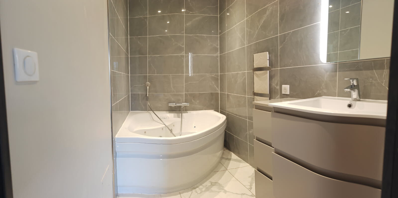 une entrée avec placard, une cuisine moderne et fonctionnelle ouverte sur un lumineux séjour prolongé par une agréable terrasse de plus de 10 m². Une chambre, également ouverte sur la terrasse, disposant d'un accès direct à une élégante salle de bain avec baignoire d'angle balnéo. WC séparé.
