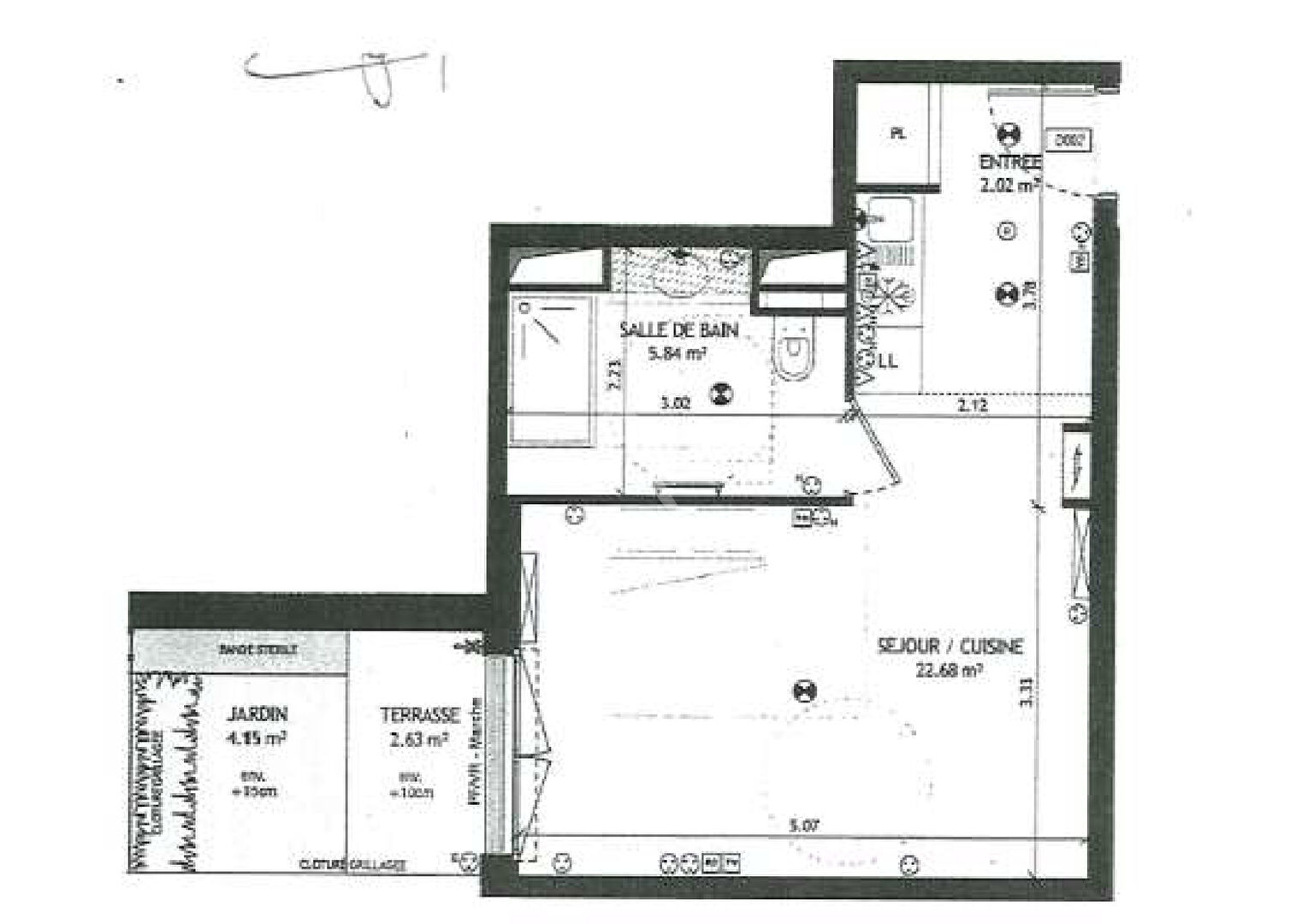 Il se compose d'une entrée, d'un placard de rangement, d'une kitchenette, d'une salle d'eau et d'une pièce de vie donnant sur un petit jardin / terrasse de 7m² exposé Sud-Ouest