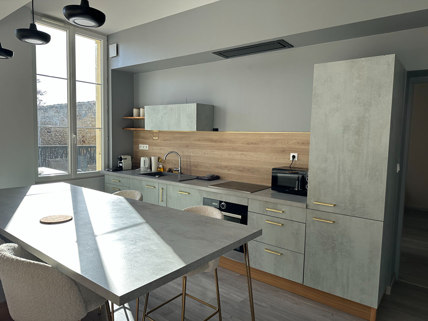 La cuisine aménagée et équipée, avec son ilot central, allie design et fonctionnalité, parfaite pour recevoir.