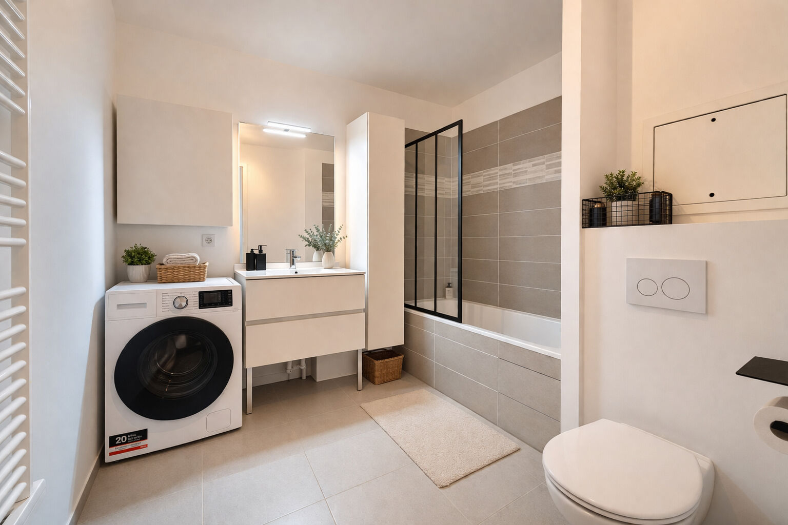 L'appartement offre un plan optimisé, sans perte d'espace : une pièce de vie avec une cuisine ouverte moderne donnant sur terrasse, deux chambres confortables, une grande salle de bains avec WC. Prestations de qualité et finitions soignées.