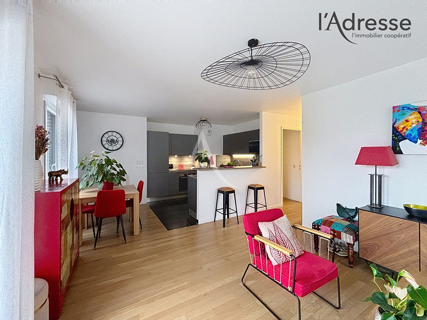 Dès l'entrée, vous découvrirez un vaste séjour de 33 m² (salon de 27 m² + cuisine haut de gamme ouverte de 6,2 m²) baigné de lumière grâce à sa double exposition Sud-Ouest. Cet espace de vie s'ouvre directement sur la terrasse, idéale pour recevoir ou profiter des beaux jours.