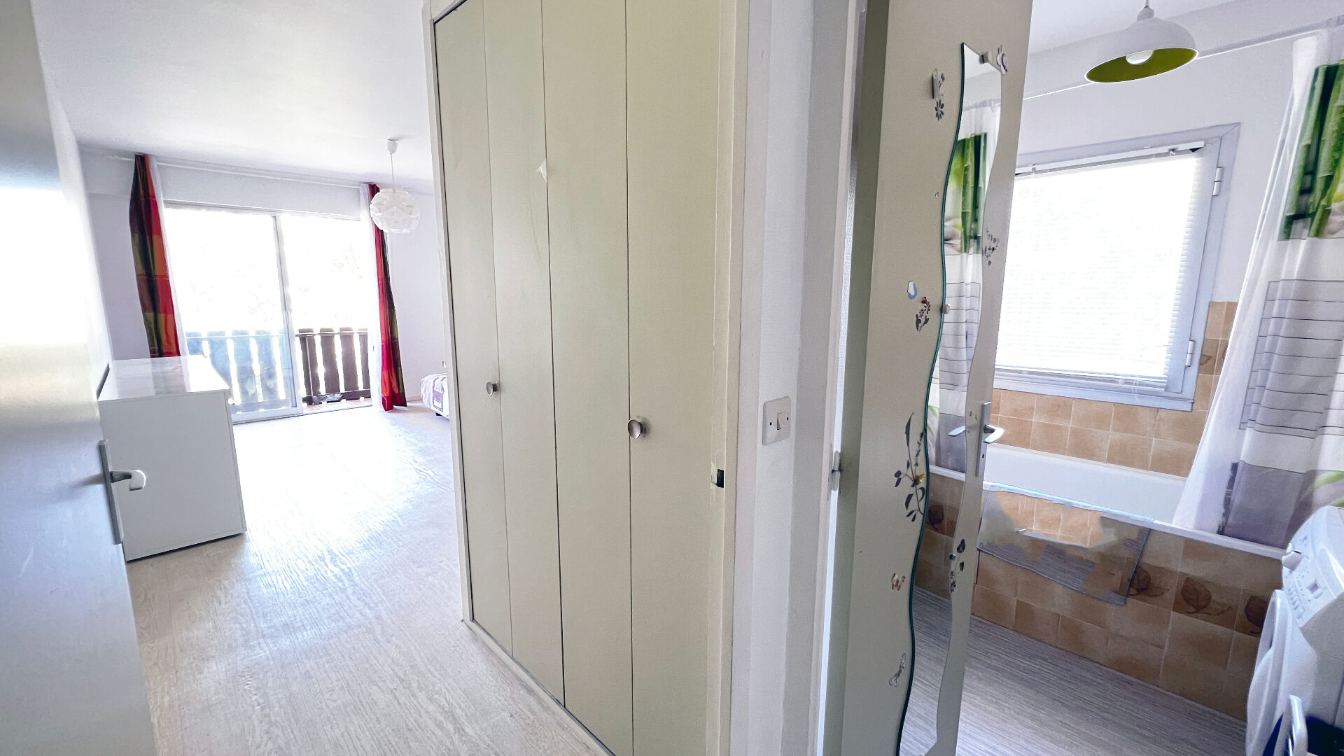 L'appartement est accessible par ascenseur, une entrée dirige vers la salle de bains avec WC, un dégagement vers la pièce de vie avec cuisine et le balcon.