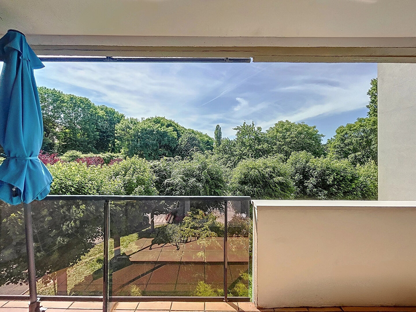 The flat comprises an entrance hall with storage space, a large BRIGHT living room opening onto an 18 m² south-west-facing BALCONY, and a separate fitted and equipped kitchen. In the sleeping area, which is well separated from the living space, you will also find two bedrooms (with the possibility of creating a third), a hallway with storage, a shower room and a separate toilet. The two bedrooms also open onto the large, unoverlooked balcony with uninterrupted views over the lawn and trees.