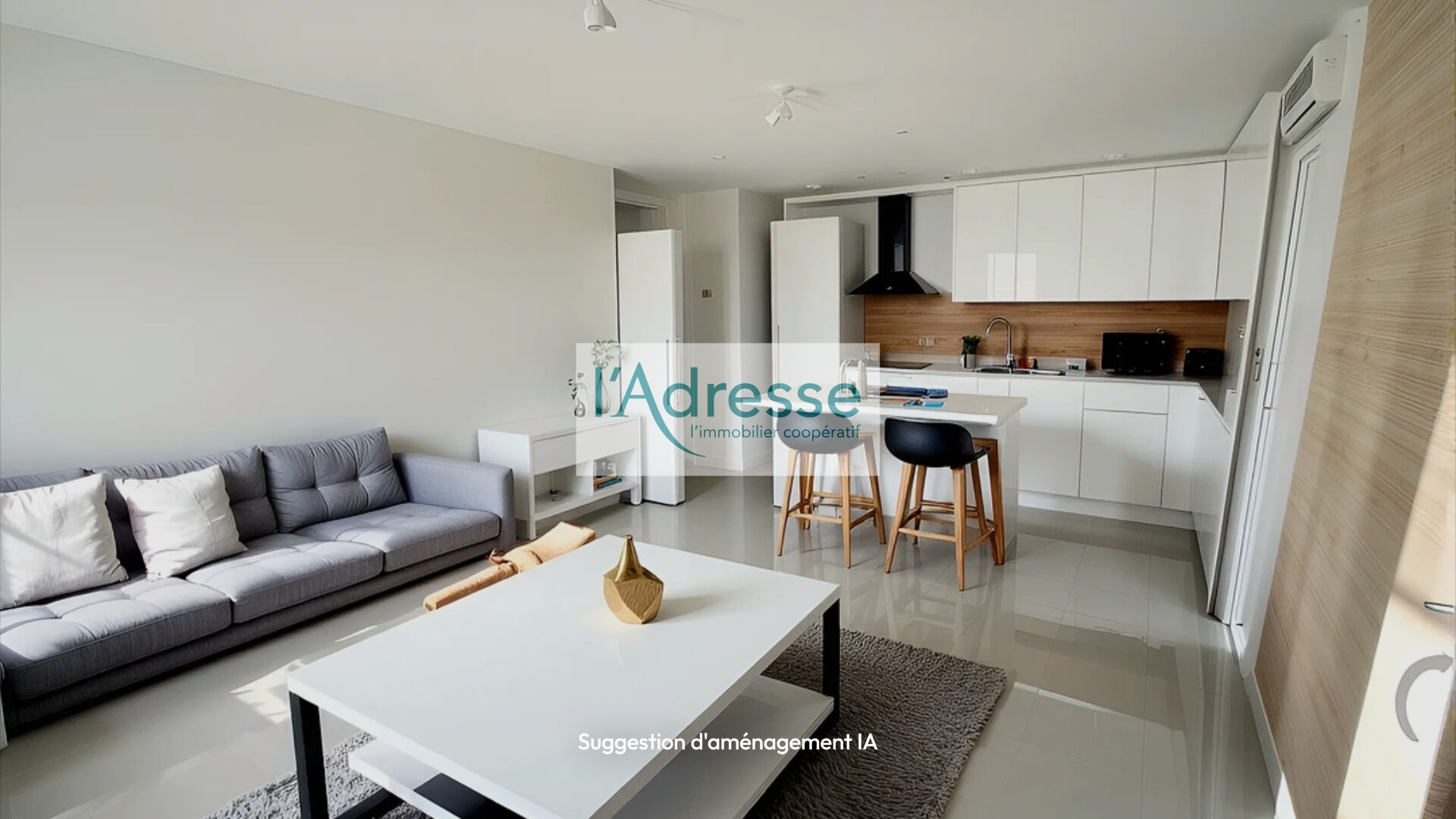 Le salon s'ouvre sur une cuisine aménagée et équipée au design contemporain.