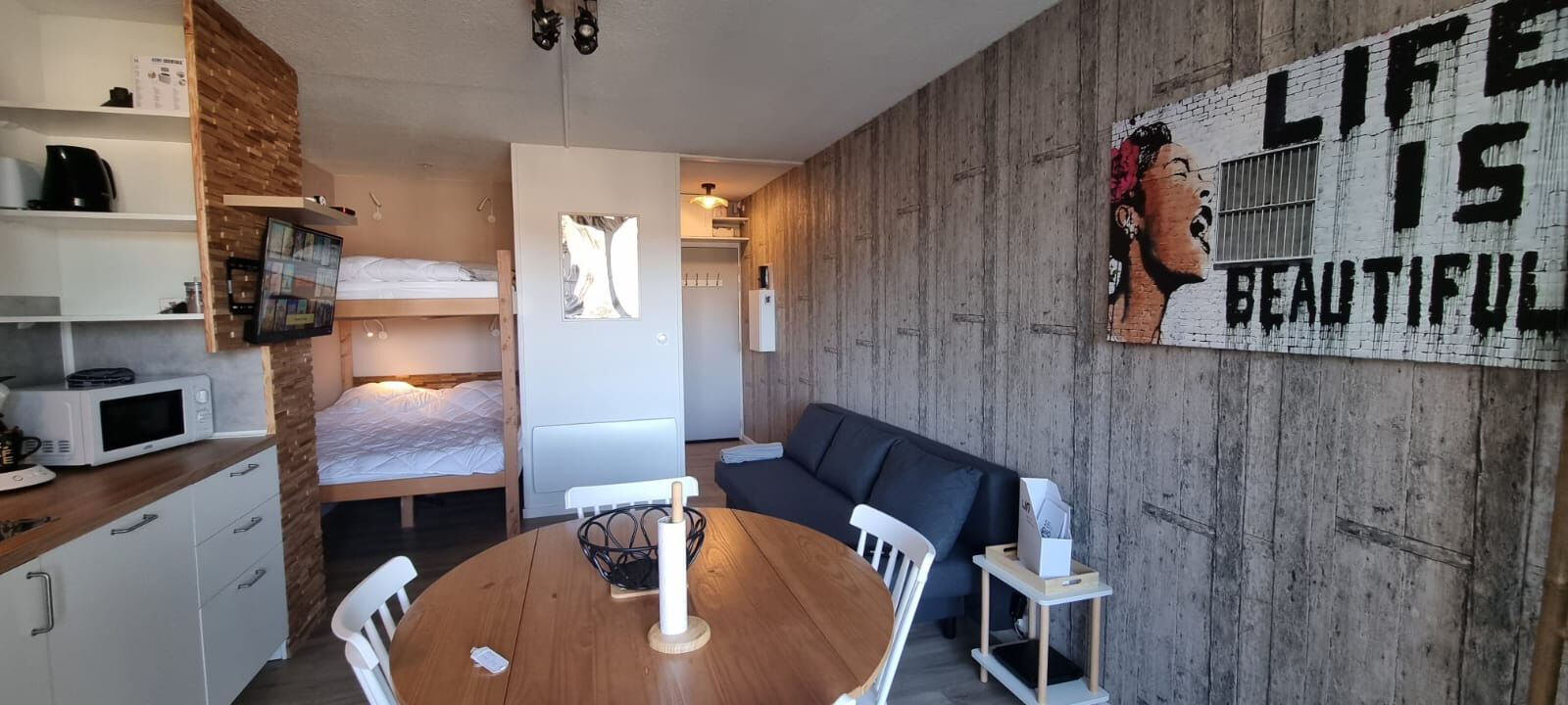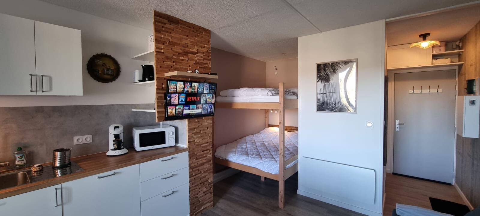 En entrant, on découvre un espace moderne au style chaleureux, avec un agencement pensé pour maximiser chaque mètre carré (cf. photos page 2 montrant les couchages superposés intégrés et l'espace cuisine rénové).