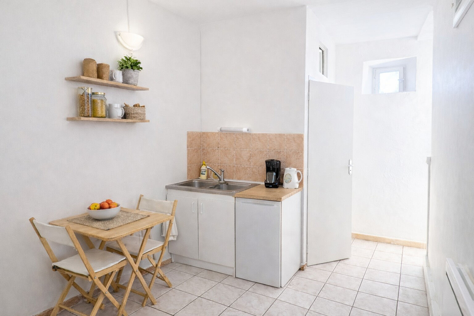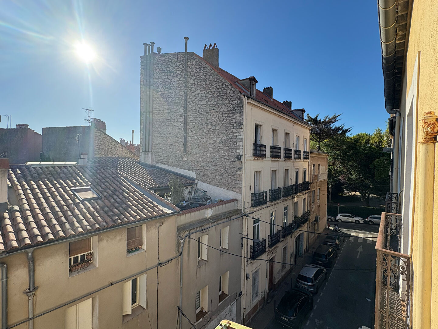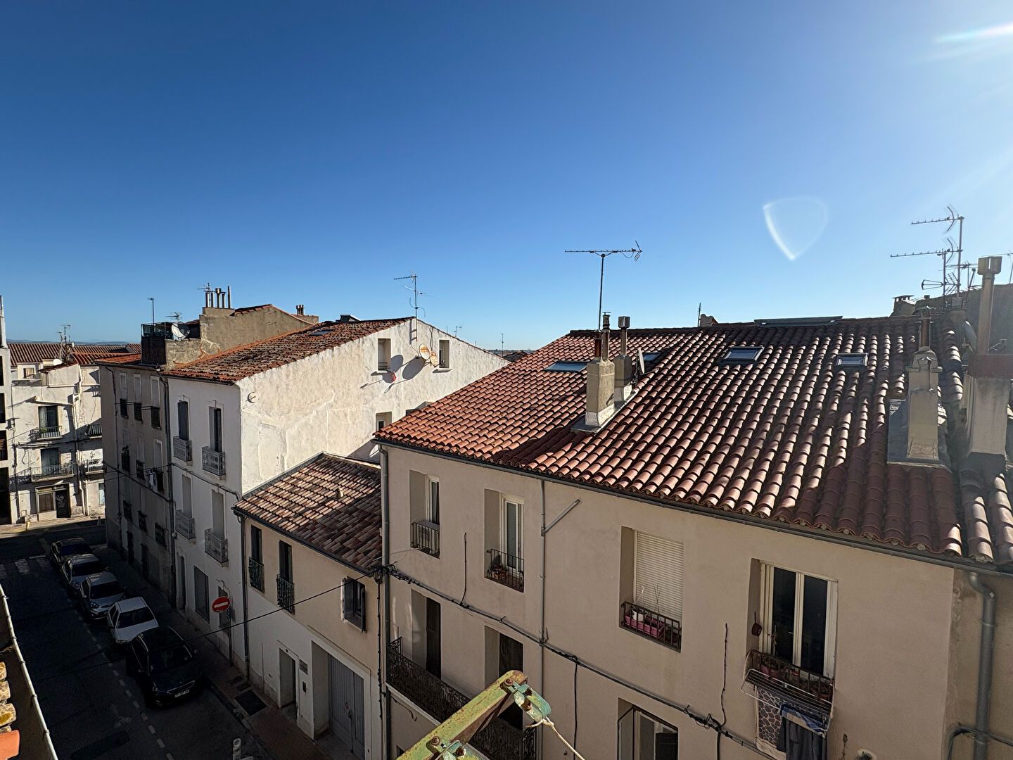 L'agencement est fonctionnel et optimisé. L'entrée dessert un espace cuisine, suivi d'une salle d'eau indépendante avec douche et WC. La pièce de vie, lumineuse, s'ouvre sur un petit balcon de type garde-corps offrant une vue dégagée sur les toits. Son exposition plein Est permet de bénéficier d'un ensoleillement agréable, notamment en matinée.