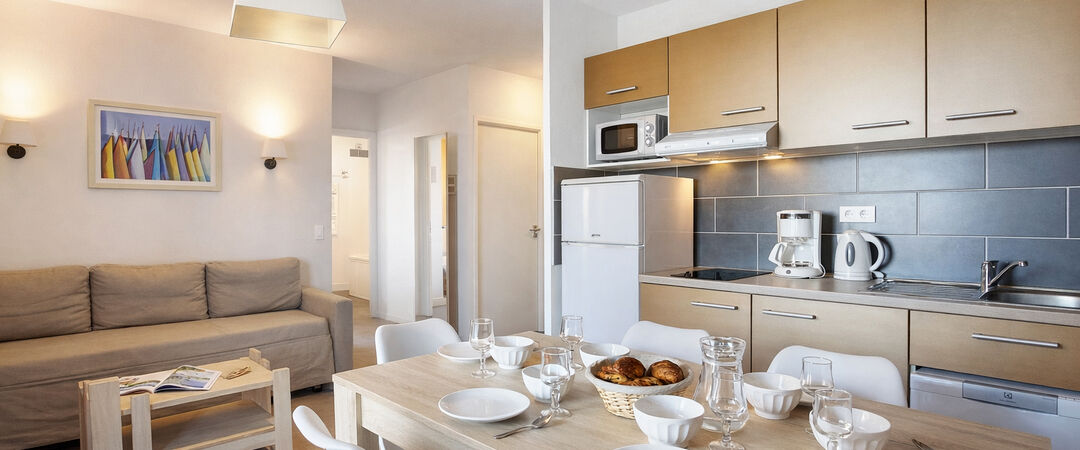 La résidence propose des hébergements confortables et fonctionnels, du studio de 24 m² pour 2 personnes au T4 de 66 m² pouvant accueillir jusqu'à 7 personnes. Les vacanciers profitent de nombreux équipements dédiés à la détente et aux loisirs : espace petit-déjeuner, piscine extérieure chauffée, salle de fitness, espace bien-être avec sauna et hammam, aire de jeux pour enfants, laverie et parking extérieur. Une salle de réunion et un service de location de vélos complètent l'offre.