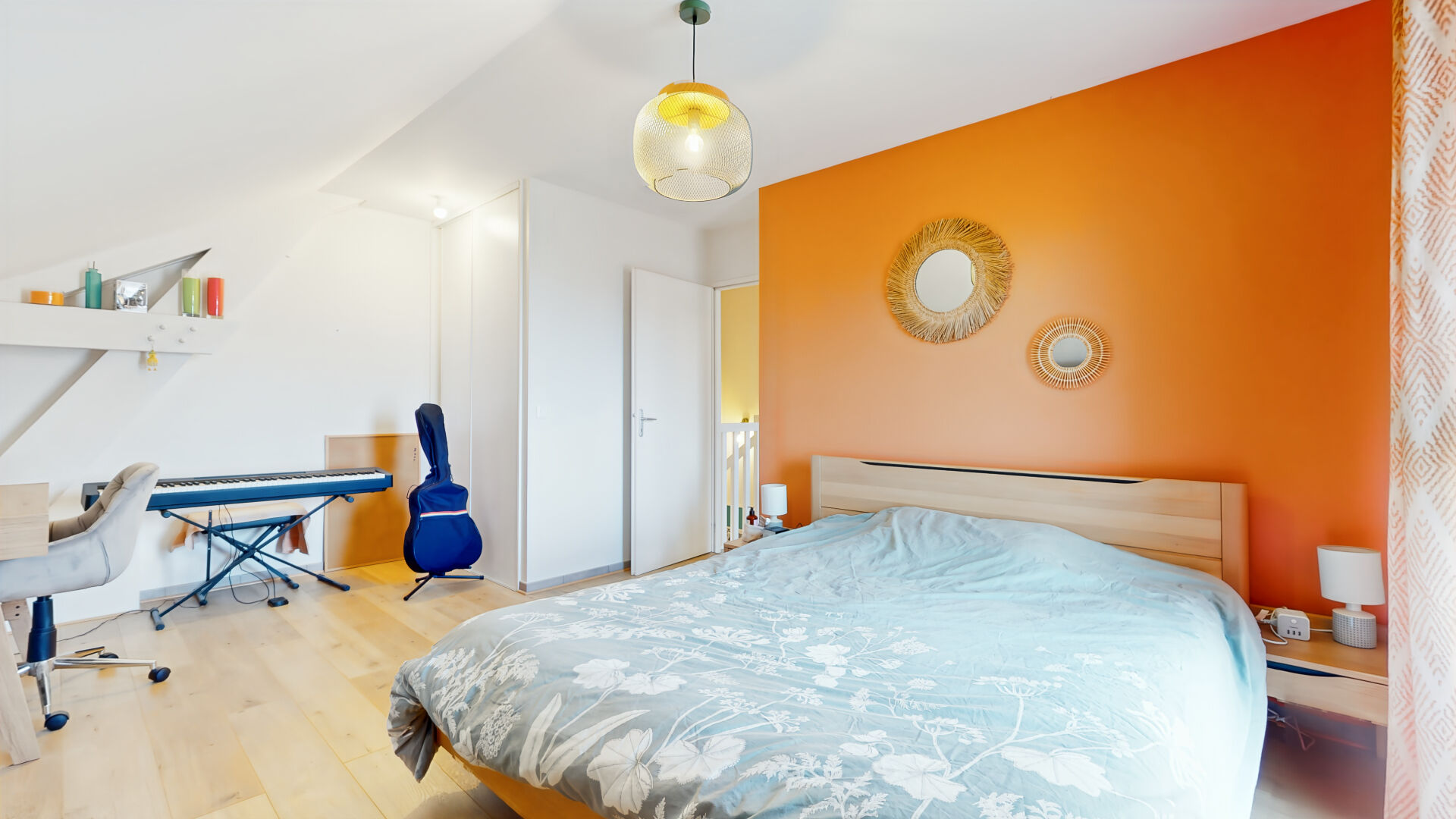 À l'étage, deux chambres accueillantes permettent de préserver le calme de chacun. Que ce soit pour un couple, une petite famille, un espace bureau ou une chambre d'amis, l'agencement s'adapte à vos projets de vie.