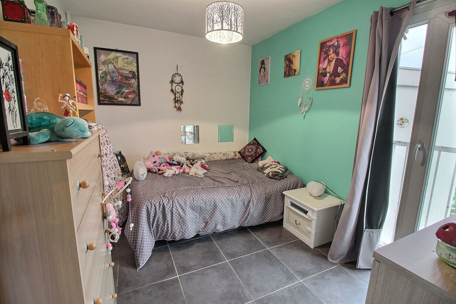Vous y trouverez une pièce à vivre entièrement carrelée et lumineuse.