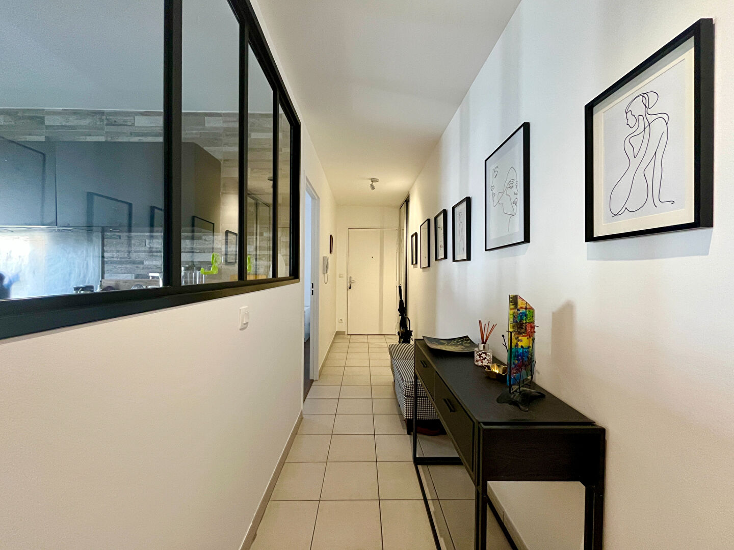 Au premier niveau un couloir dessert une chambre, une salle de bain avec douche et wc, le séjour et une cuisine semi ouverte entièrement équipée et sa verrière.