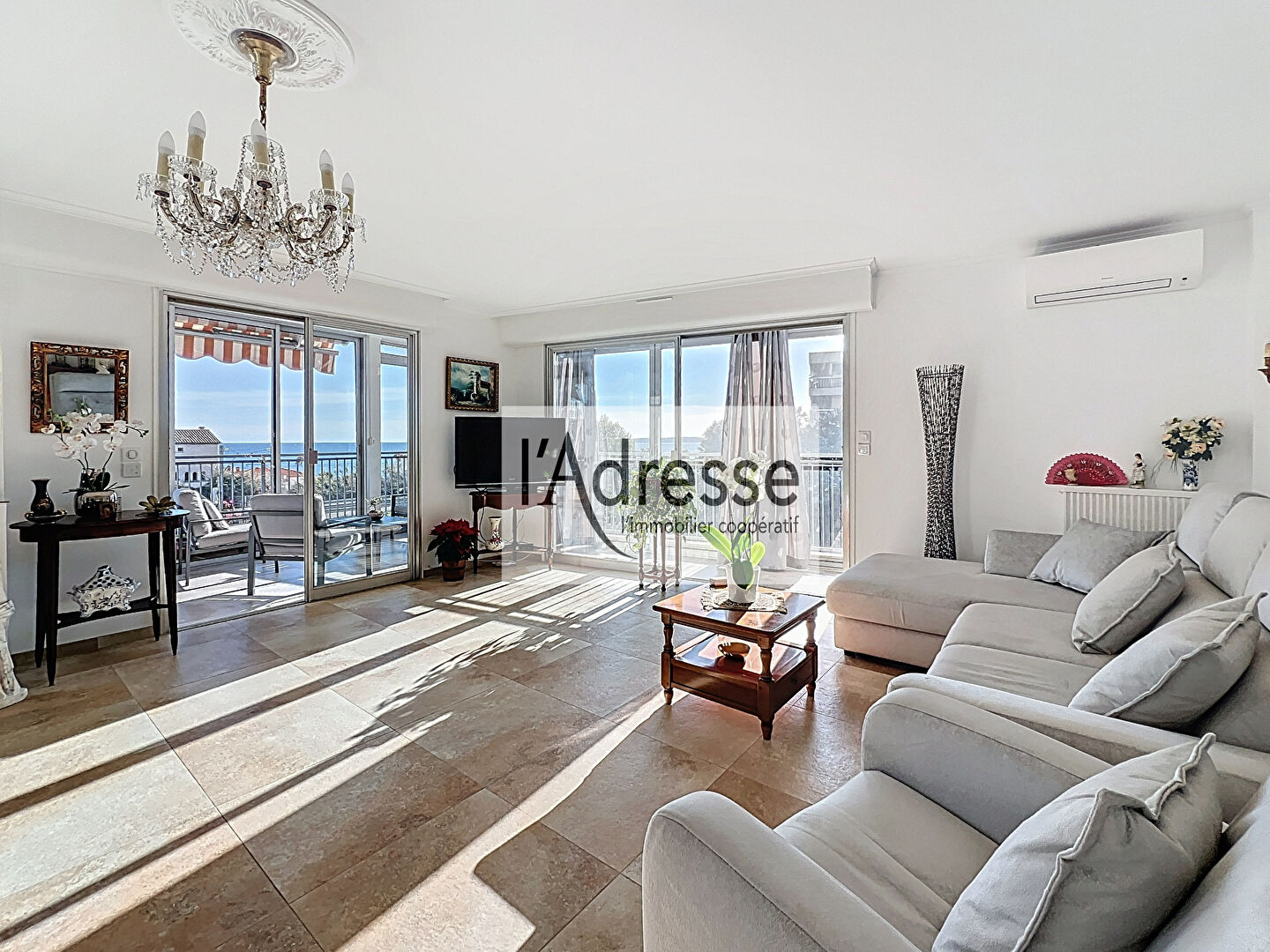 Le séjour ainsi que la salle à manger (climatisé) vous offre une vue jusqu'à la mer et les Îles de Lérins.