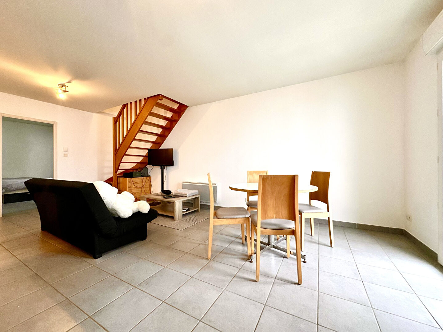 Situé au 2-ème étage, cet appartement en duplex lumineux se compose comme suit : une entrée, une belle cuisine équipée ouverte sur le séjour, une salle de bains avec toilette, une chambre.