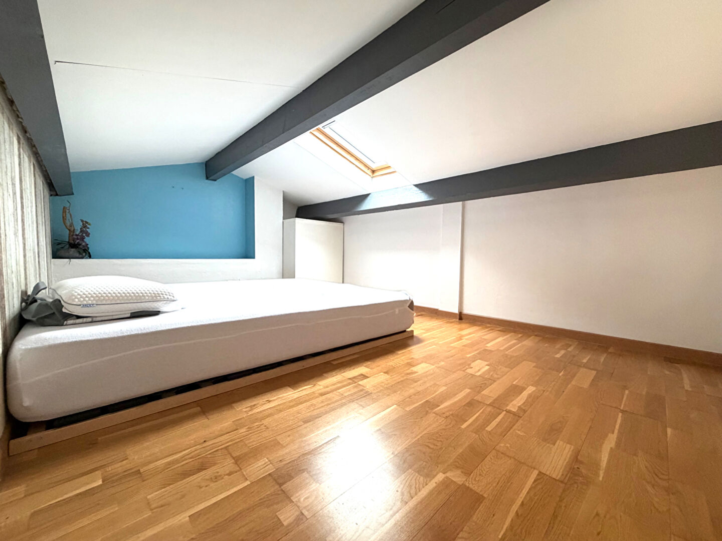 Un escalier intérieur mène à une mezzanine d'environ 10 m² avec vélux (hauteur sous plafond inférieure à 1,80 m), idéale pour un espace couchage.