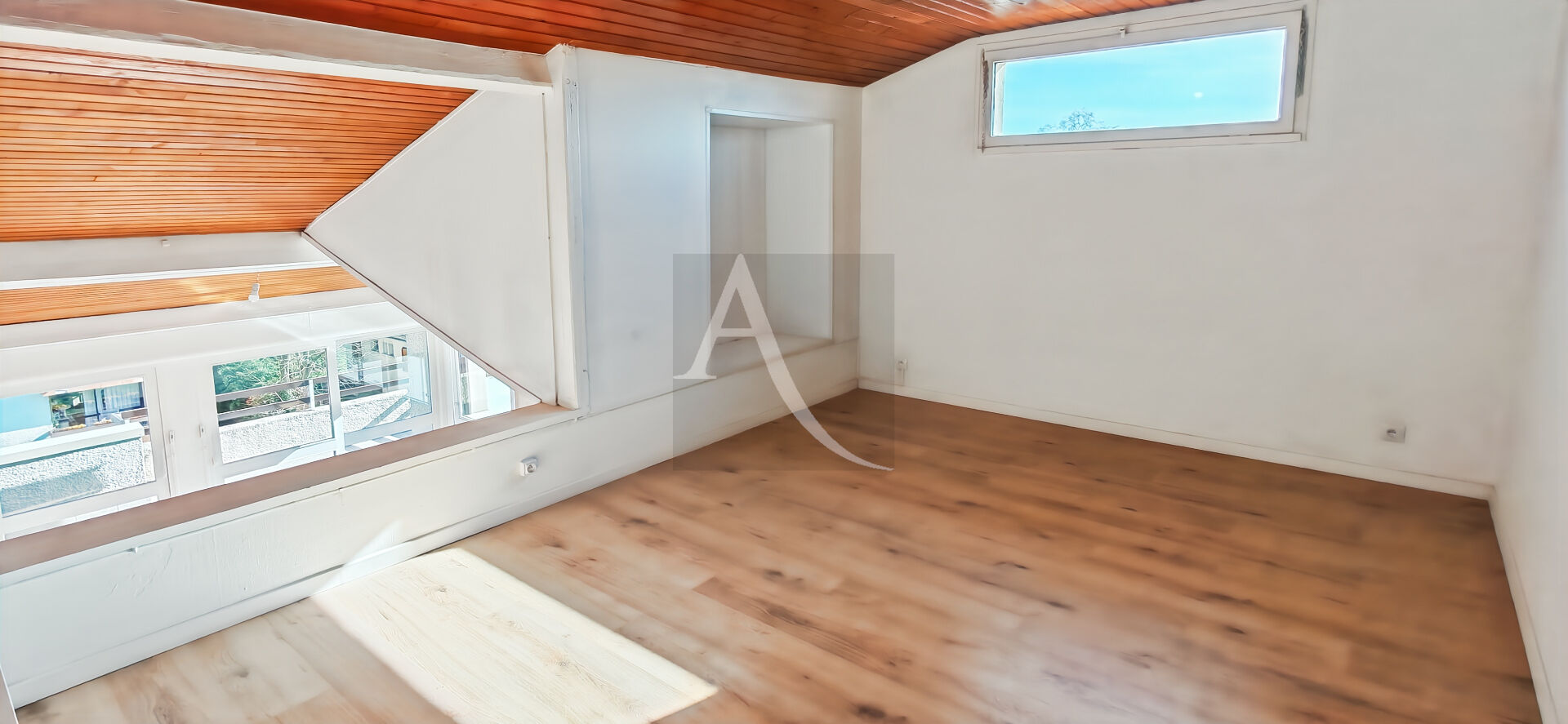 Une belle pièce de vie de 35m2, baignée de lumière avec ses baies vitrées et double terrasse. Une mezzanine domine la pièce principale, et pourrait être cloisonnée pour une 3ème belle chambre. Vous retrouverez à côté une cuisine équipée indépendante qui pourrait être ouverte sur la pièce de vie.