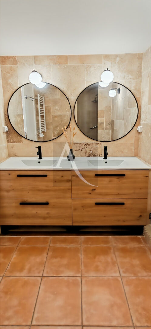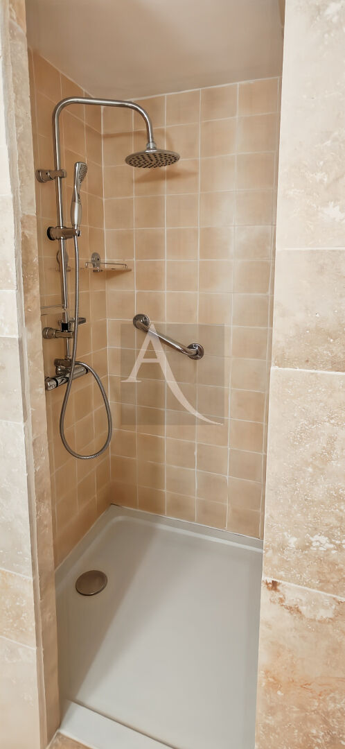 Deux chambres dont une avec placard et un accès direct à la terrasse, un cellier, une entrée, un WC indépendant et une salle d'eau refaite à neuf en travertin.