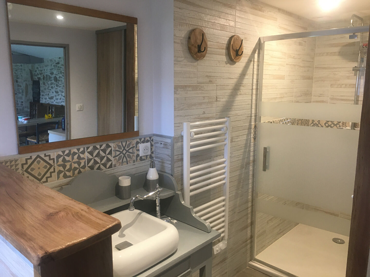 A l'extérieur : un gîte avec une façade en pierres apparente d'environ 64m² composé : d'un salon/séjour avec poêle à pellets, une cuisine (aménagée/équipée), une grande chambre, une salle d'eau avec wc.