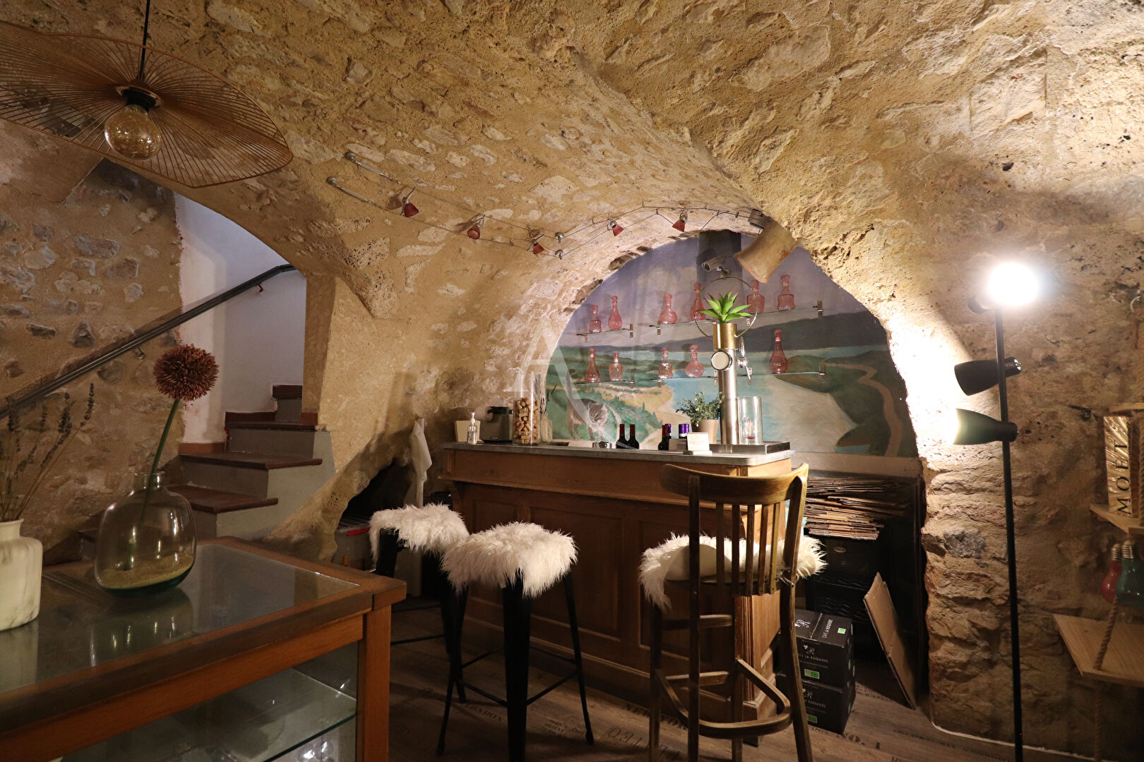 Composé d'une salle destinée à vos futurs projets, d'une cave aménagée en salle de dégustation, d'une cuisine au 1er étage, et d'une chambre froide au 2ème étage.