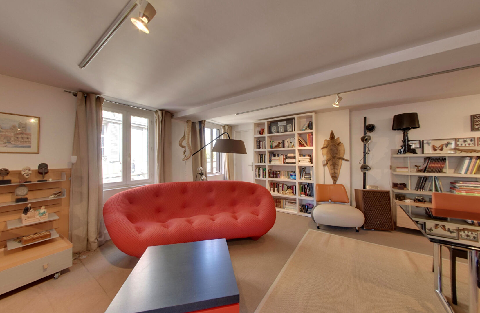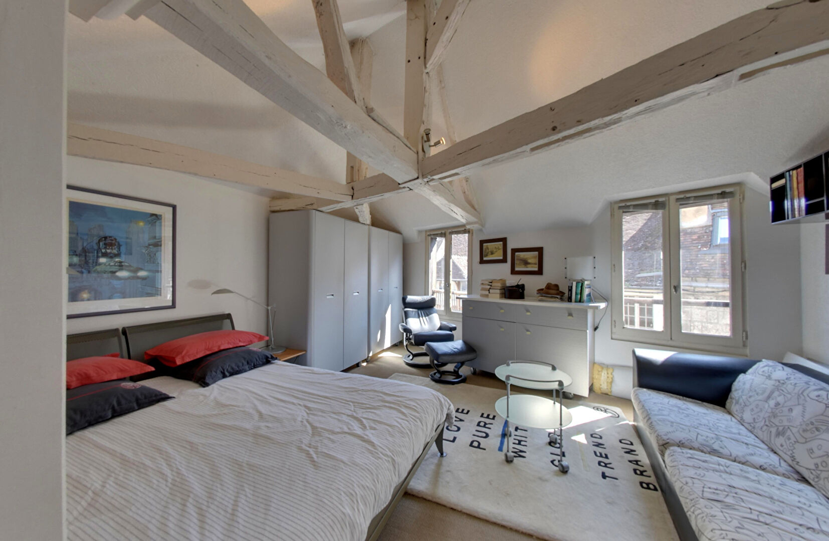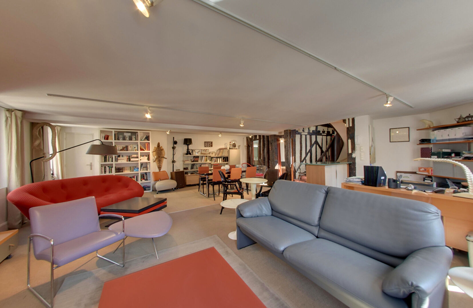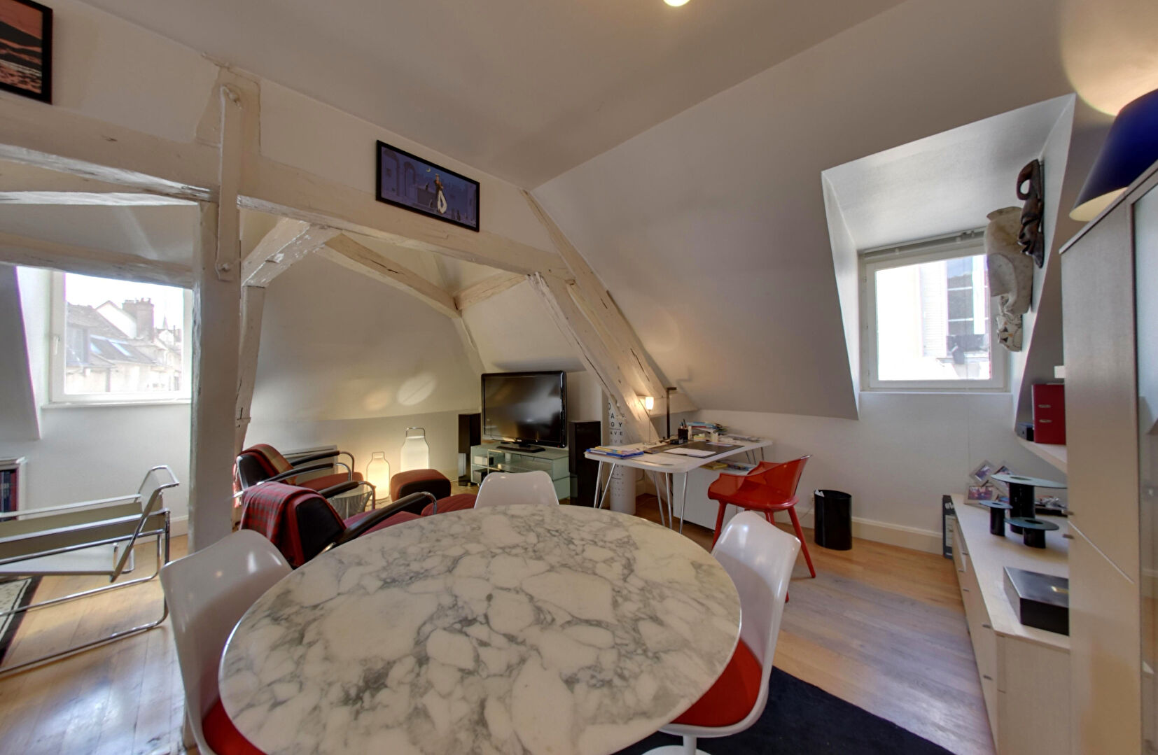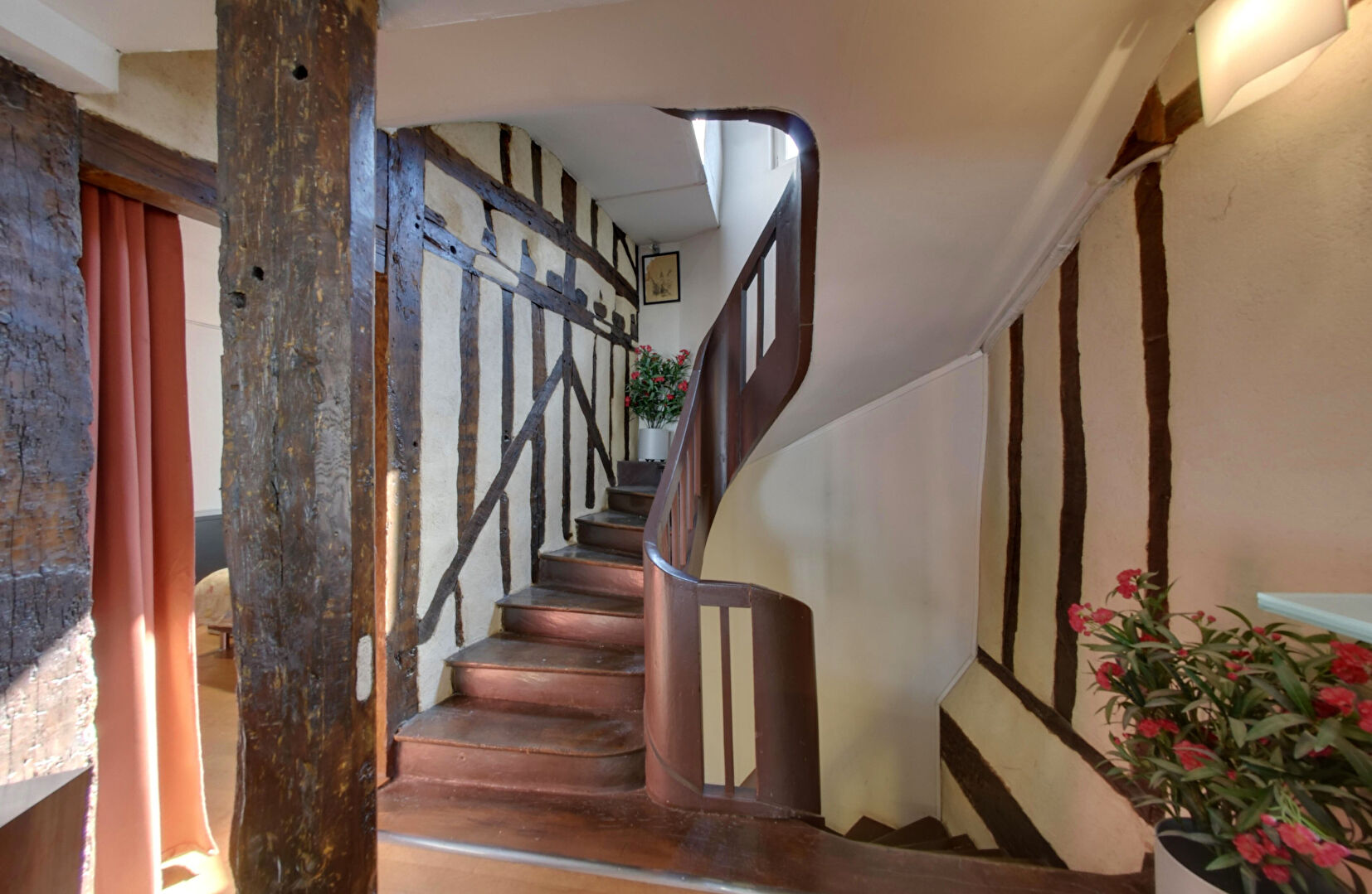 La façade à colombages, les belles poutres apparentes et les volumes généreux confèrent au duplex une luminosité et un cachet rares ; l'agencement permet une division aisée en deux logements, augmentant les possibilités de rendement locatif ou d'usage.