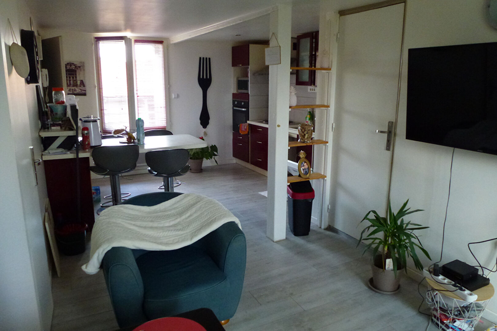 Une pièce de vie, toilette, salle d'eau, cuisine aménagée et deux chambres.