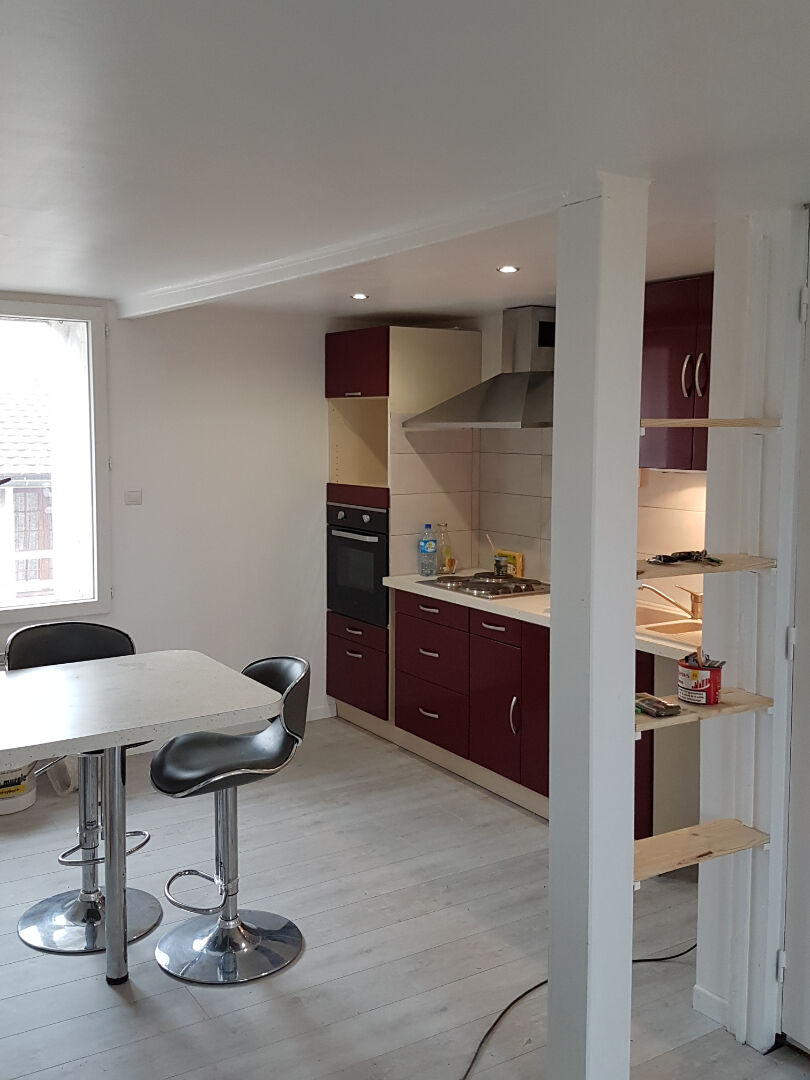 Une pièce de vie avec une cuisine aménagée, une salle d'eau avec toilette et une chambre.