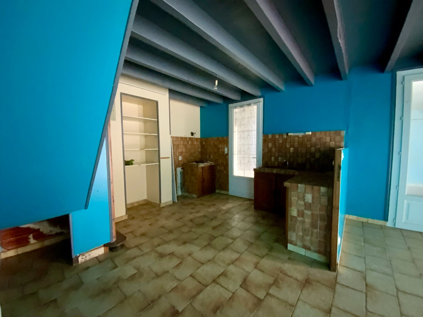 Dans la deuxième partie du bâtiment, vous trouverez une pièce de vie avec insert et cuisine